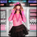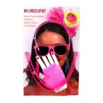 80’s dress up accessories costume kit. Includes pink lacey headband with bow, pink sunglasses, pink lightning bolt earrings, pink necklace, pink short fingerless gloves, and neon bracelets.