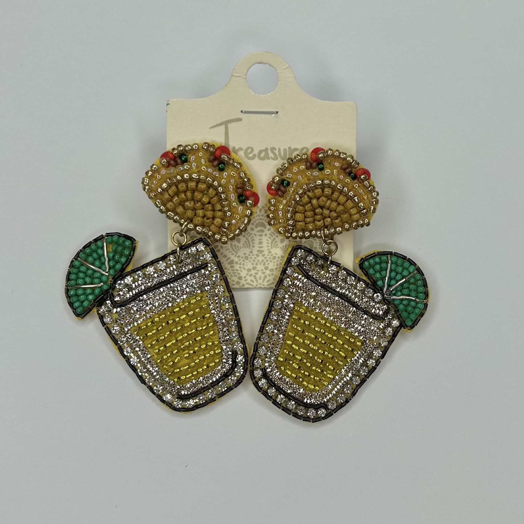 Playful beaded earrings featuring a yellow drink with a lime on the rim and a cute taco charm, perfect for taco lovers and fiesta vibes.