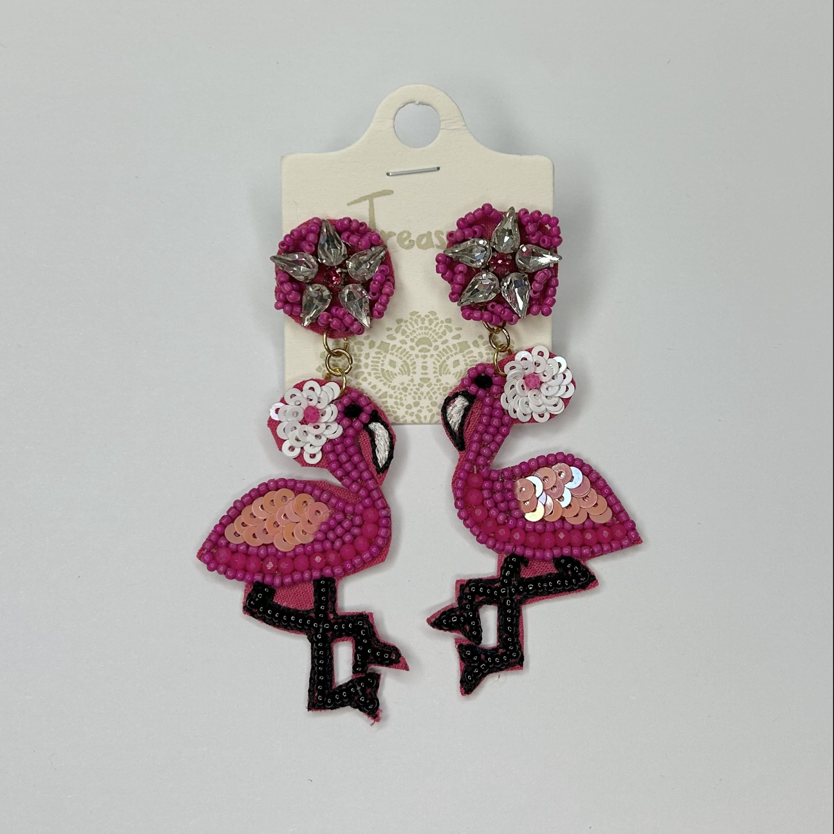 Vibrant beaded earrings featuring dangle pink flamingos adorned with white flower crowns, adding a playful, tropical touch that’s perfect for summer vibes and bold, fun fashion statements.