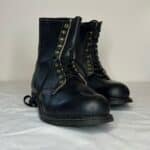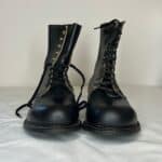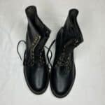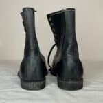 Black combat-style boots. Leather upper, all other parts man-made material. Gold eyelets. Black laces. “Mason Shoe” on soles. From bottom to top: five eyelets, four hooks, one eyelet.
