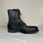 Black combat-style boots. Leather upper, all other parts man-made material. Gold eyelets. Black laces. "Mason Shoe" on soles. From bottom to top: five eyelets, four hooks, one eyelet.