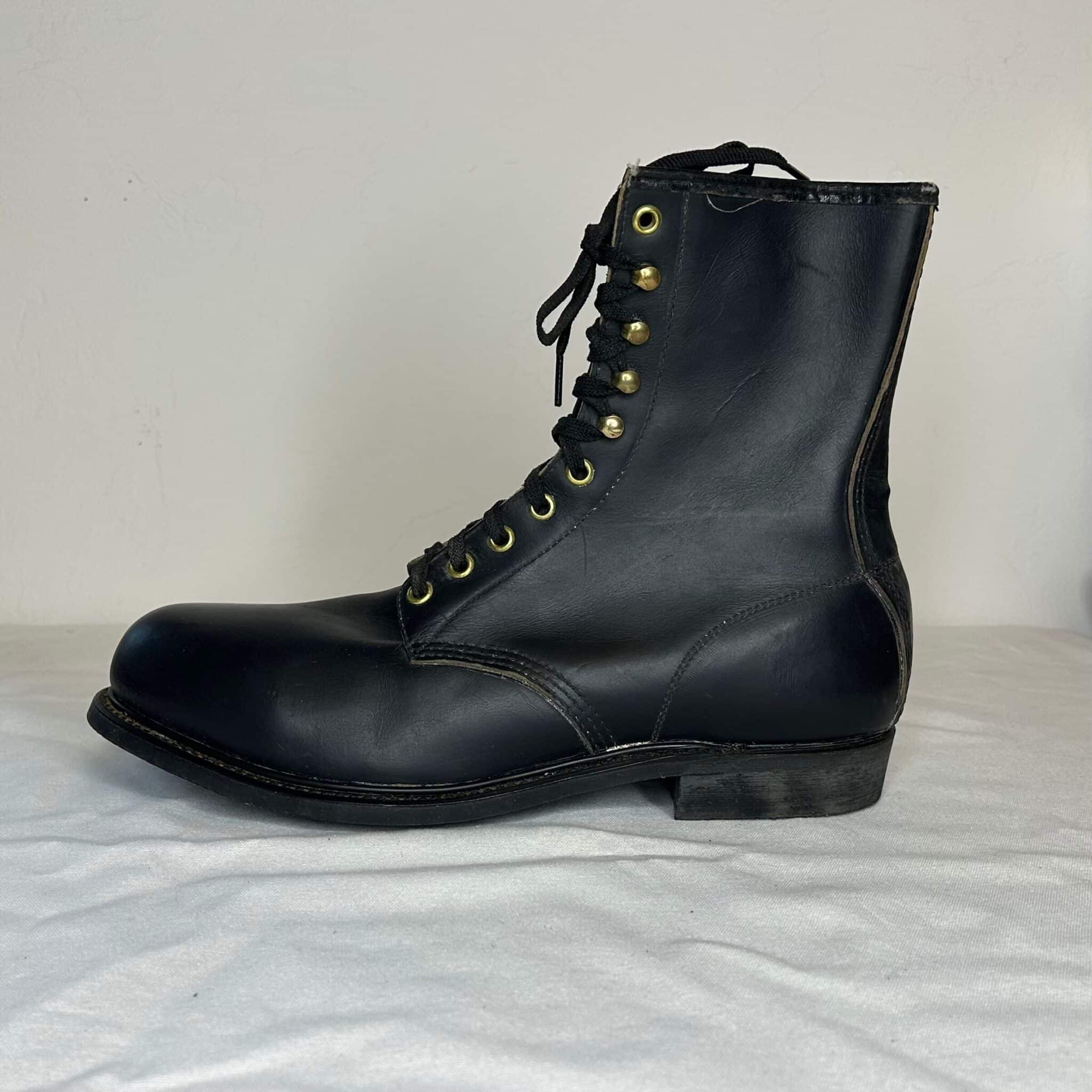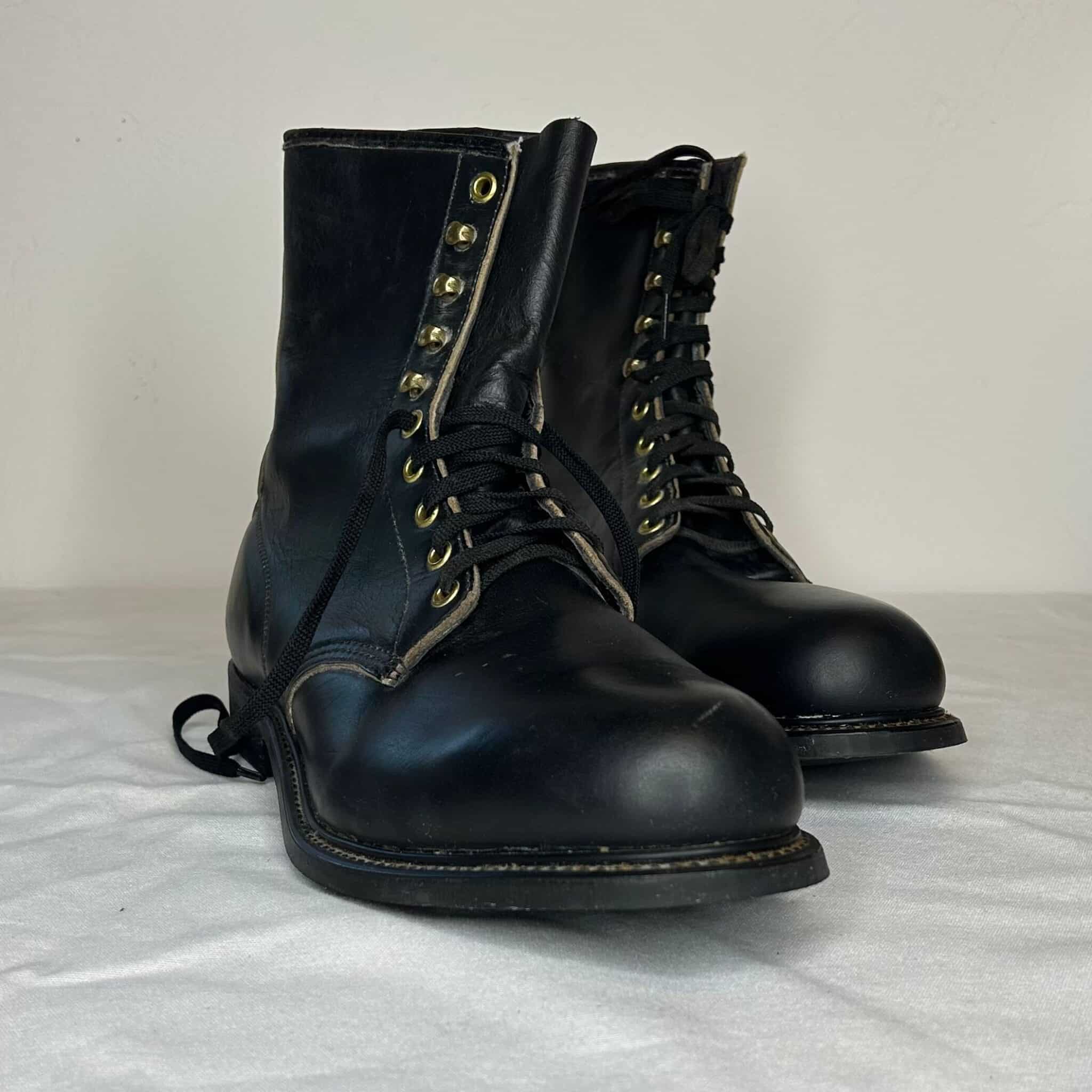 Black combat-style boots. Leather upper, all other parts man-made material. Gold eyelets. Black laces. "Mason Shoe" on soles. From bottom to top: five eyelets, four hooks, one eyelet.