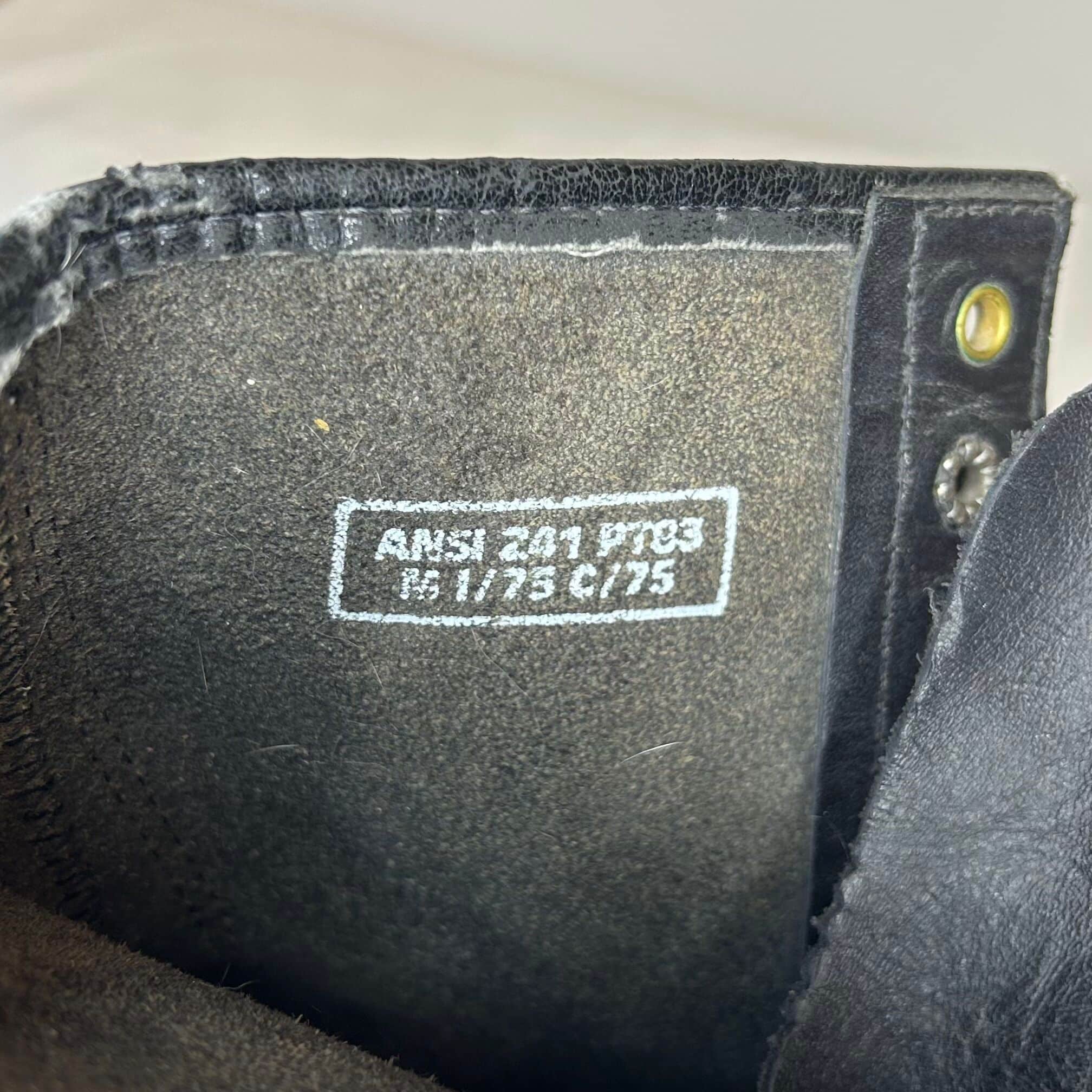 Black combat-style boots. Leather upper, all other parts man-made material. Gold eyelets. Black laces. “Mason Shoe” on soles. From bottom to top: five eyelets, four hooks, one eyelet.