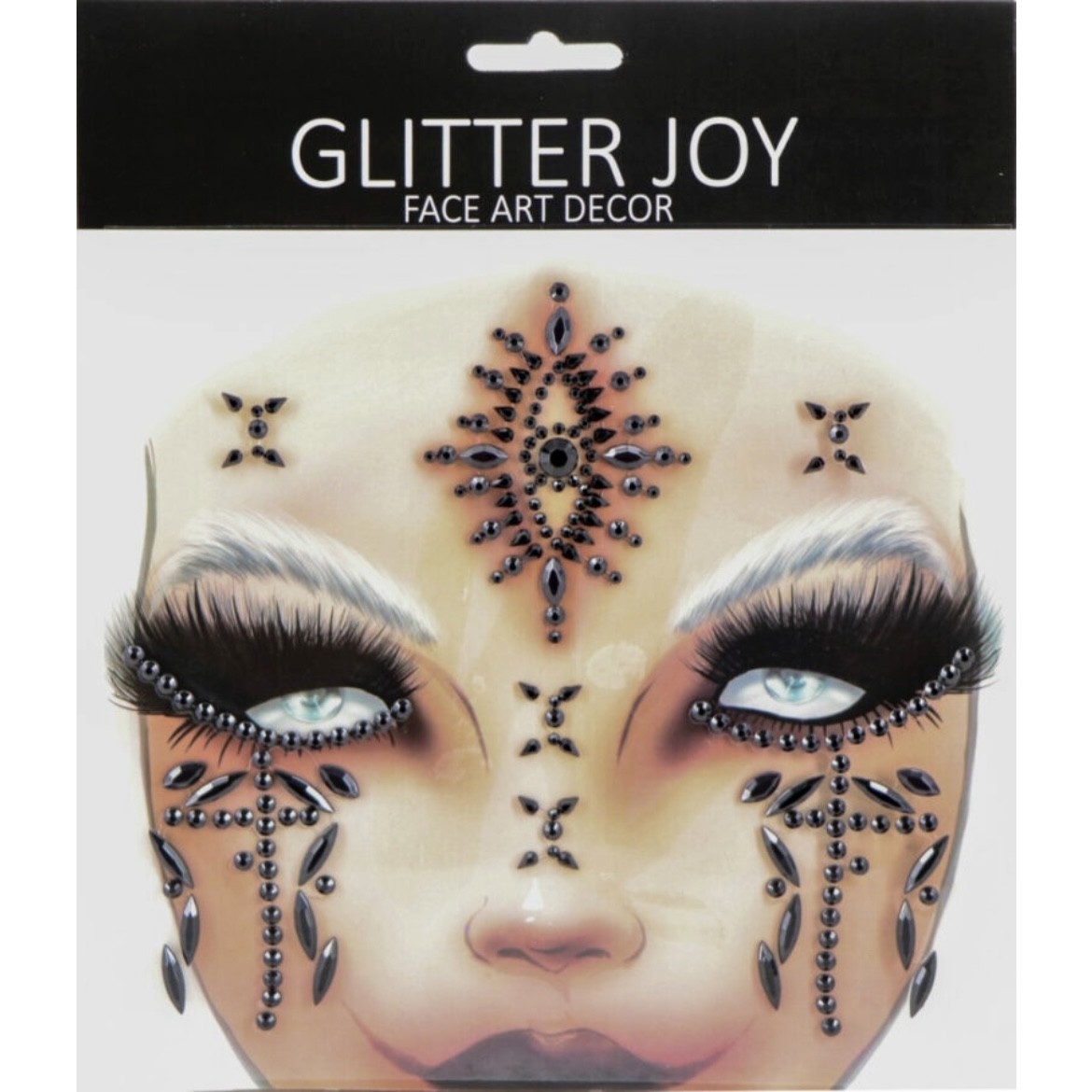 Features easy to apply black gems arranged in a striking pattern across the forehead above the eyebrows, down the bridge of the nose, and under the eyes for a bold, festival ready look.
