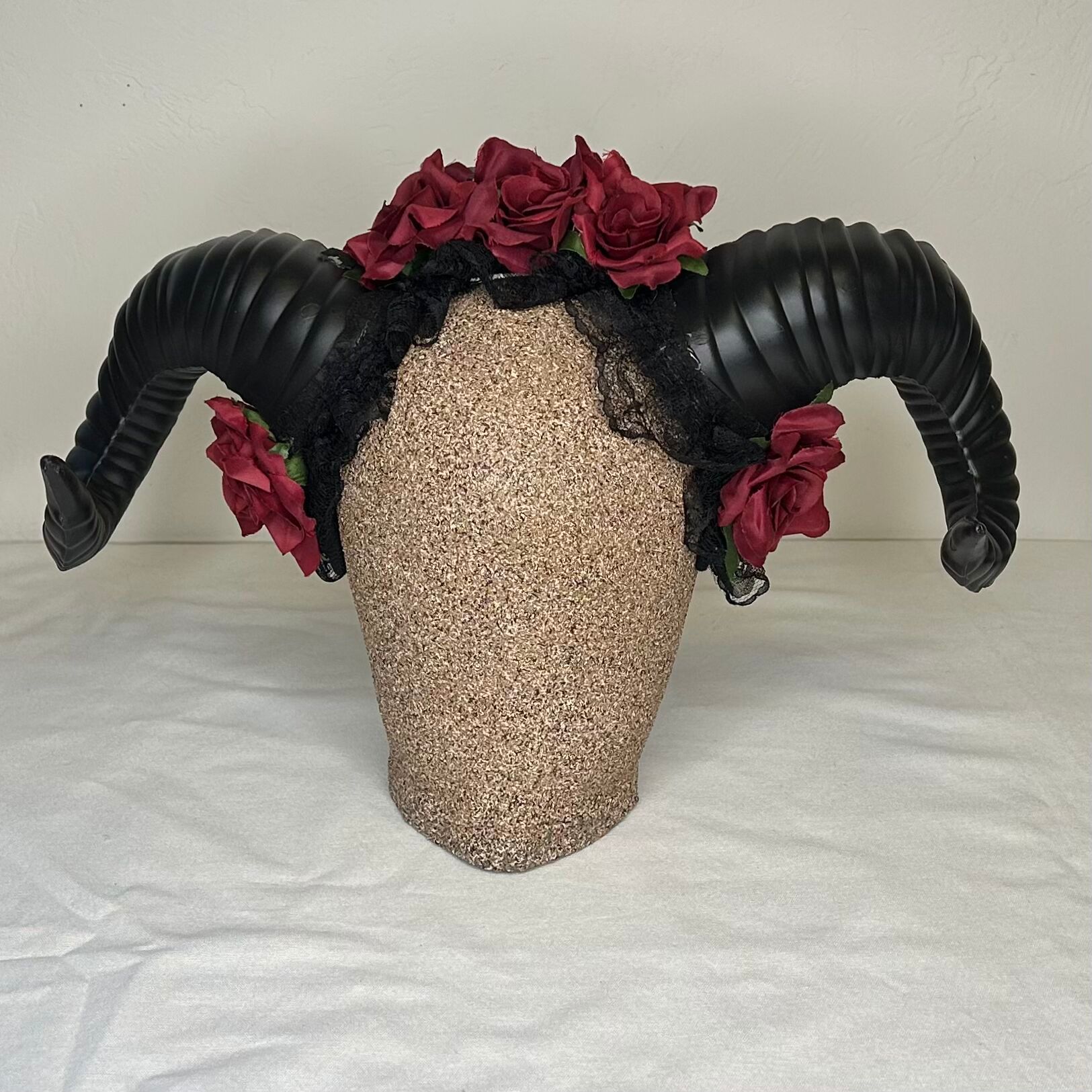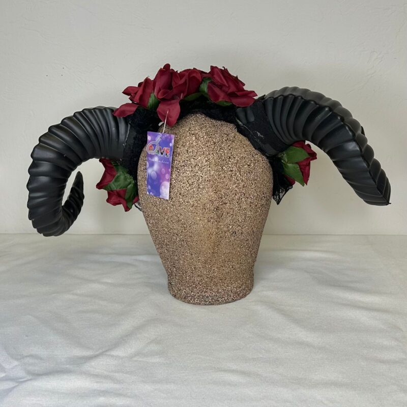 Black fabric covered headband with black ram style horns, black lace trim, and red artificial roses.