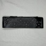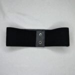 Elastic belt. Large leather panel on front. Five-petal flower secured by sphere rivets. Two clasps in back. 30″.
