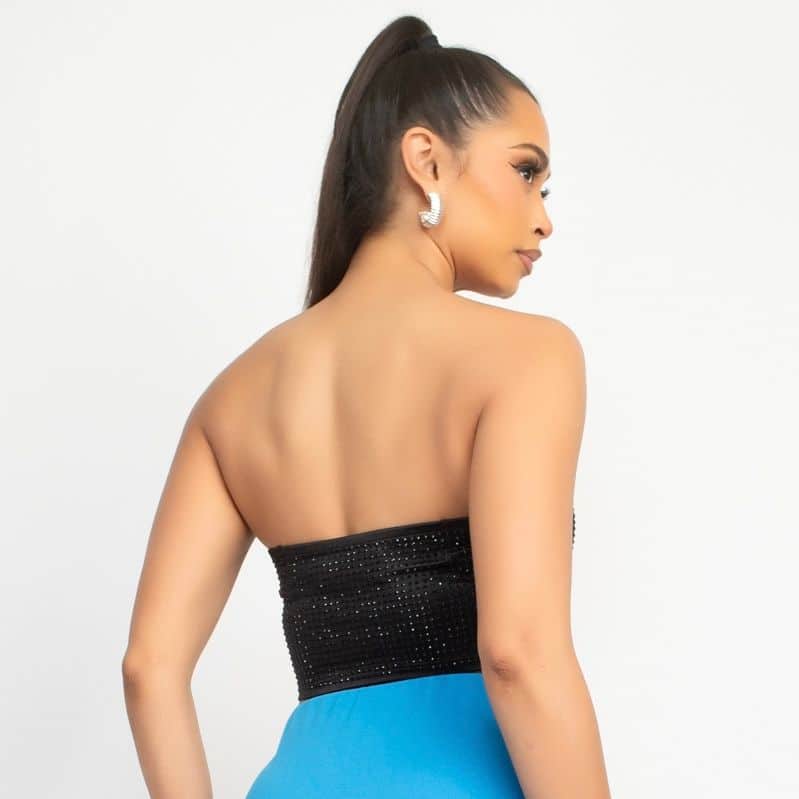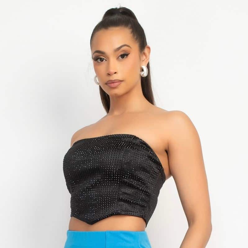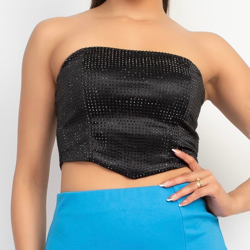 Blashe black tube top. Small black rhinestones on outer layer. Silicone anti-slip line at top of bodice. Shell: 95% polyester, 5% spandex. Lining: 100% polyester.