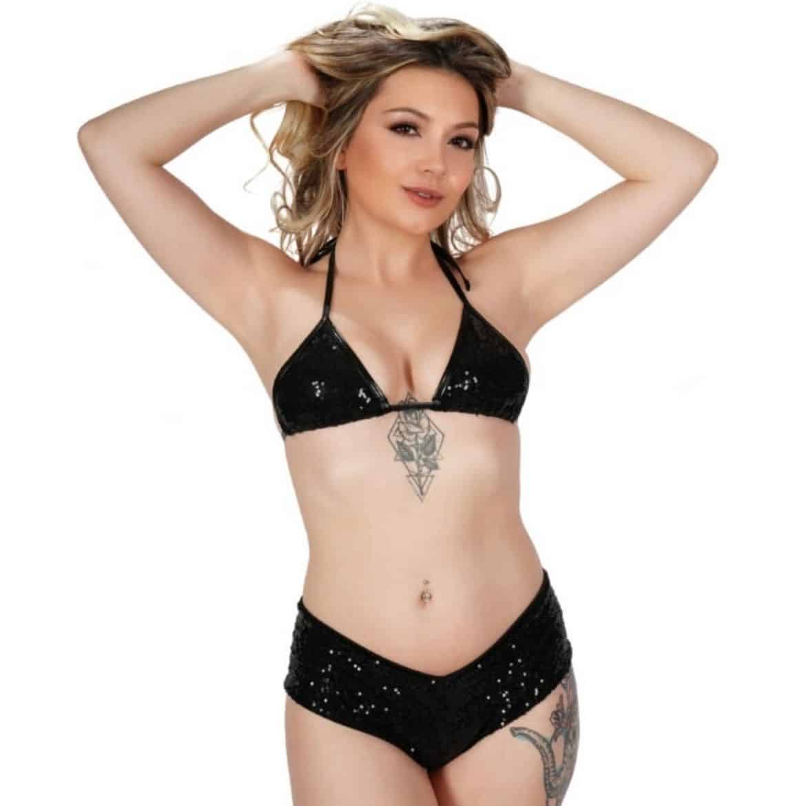 Black sequin 2-piece bikini-style lingerie set. Tie back triangle top and booty shorts with scrunch in the back. Lined in black fabric. One Size. Bottom of cups measures 6″, top of shorts measures 29″ around. 100% polyester, fabric has some stretch.