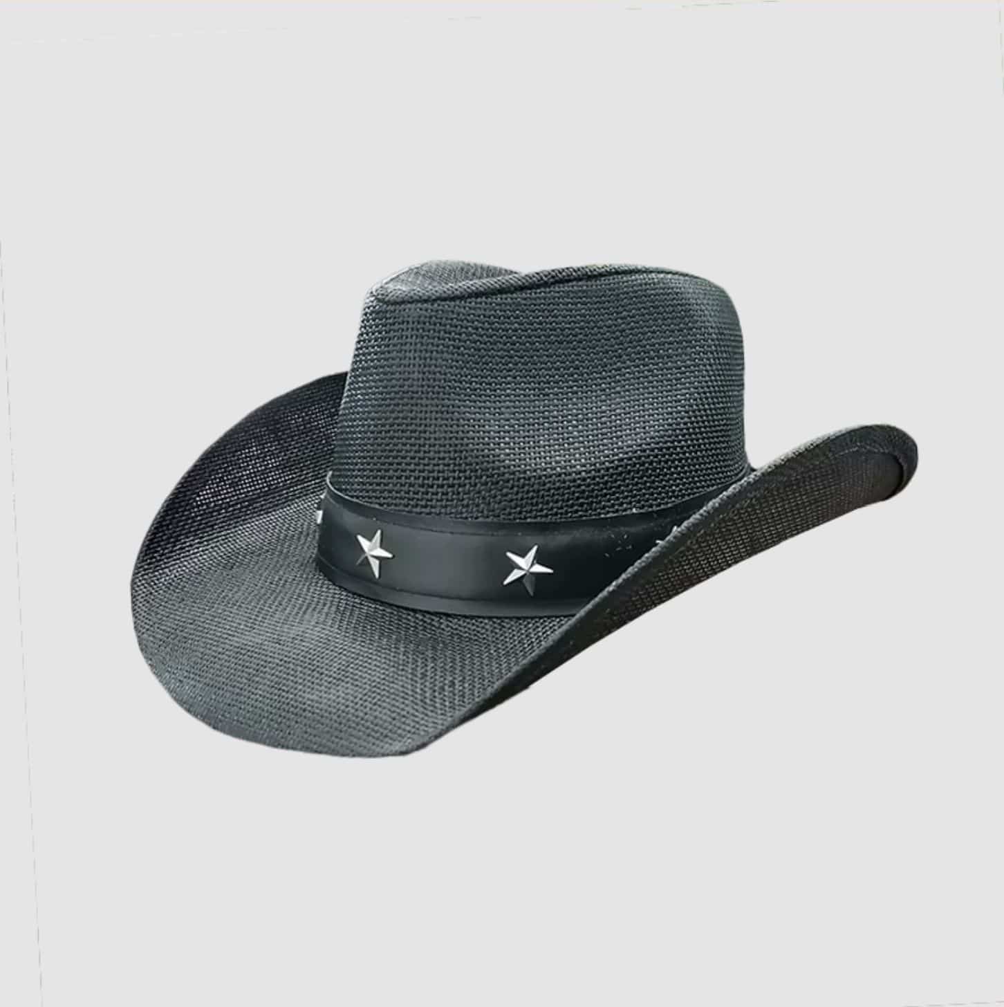 Black woven cowboy hat. 1 3/8″ black band with silver stars.