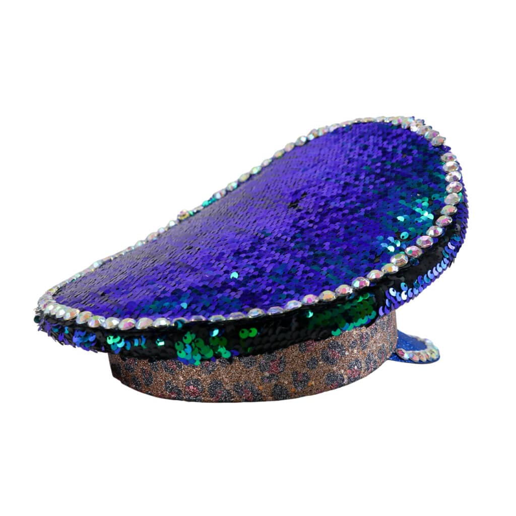 Captain hat with iridescent green, blue, and purple sequins on top and sides. Golden applique with multicolored gems on front. Pink and golden sparkly cheetah print trim. Blue sparkly brim with rhinestone trim. Black elastic chin strap. 100% polyester.