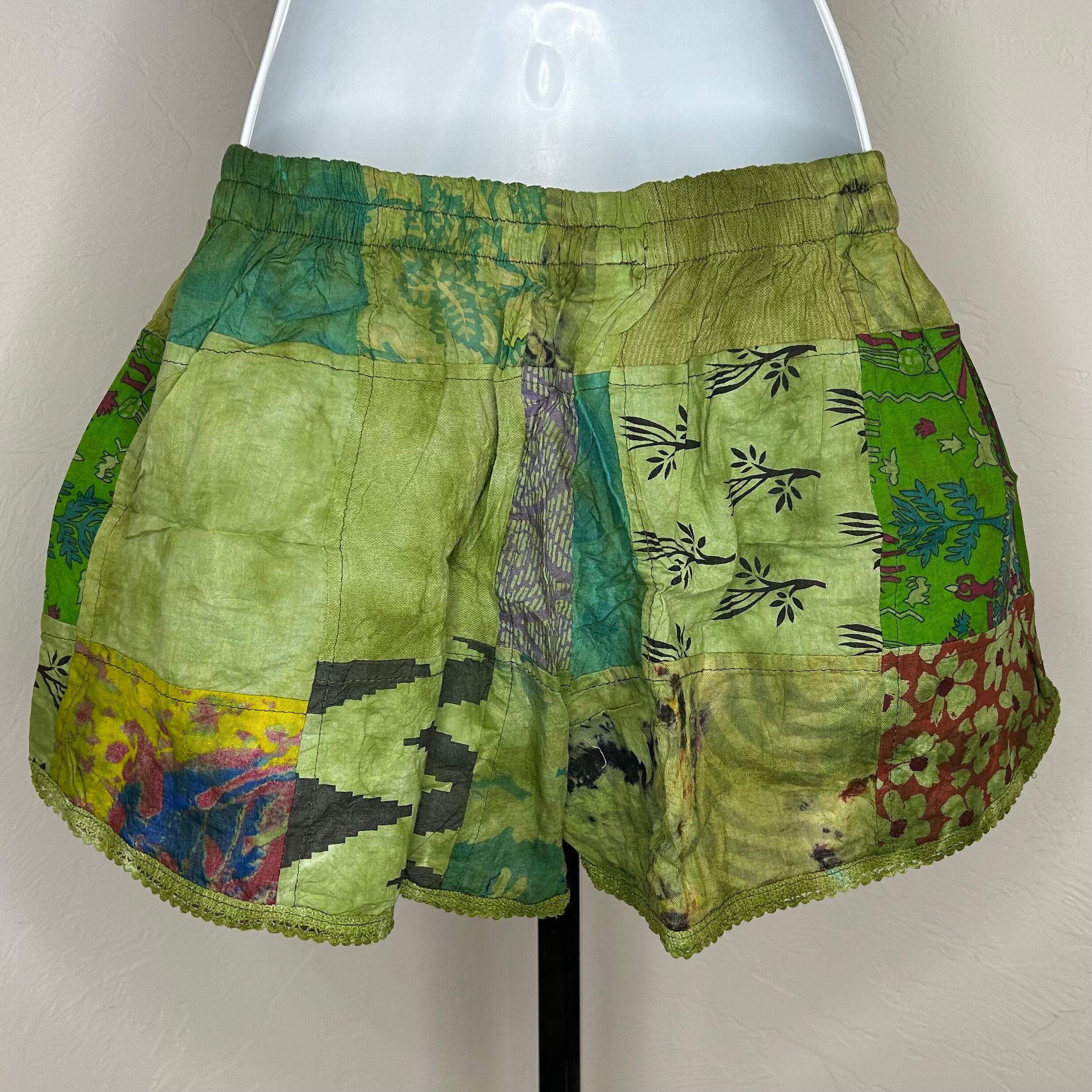 Kathmandu Imports blue split shorts. Multicolor patchwork. Exact design differs between pairs. Elastic waistband.