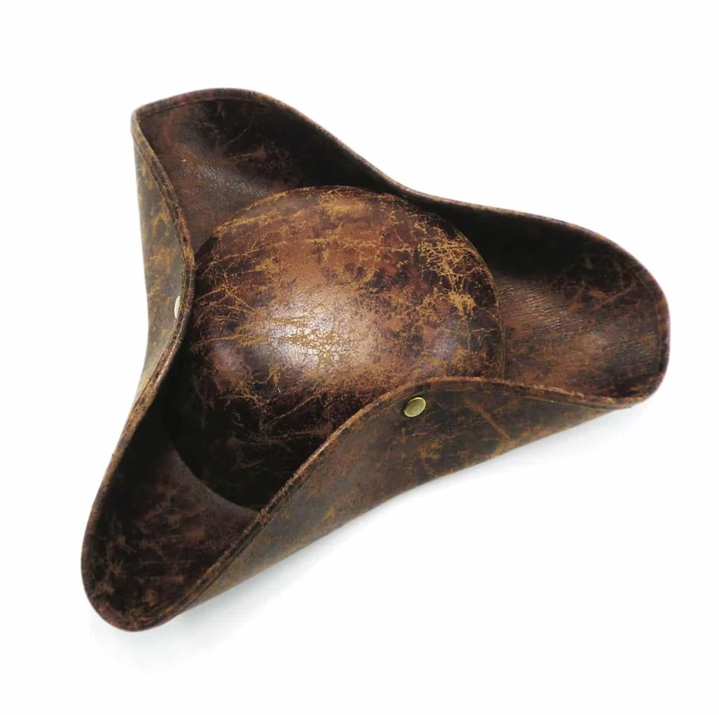 Black faux leather pirate hat. Golden snaps keeping the back and sides folded in.