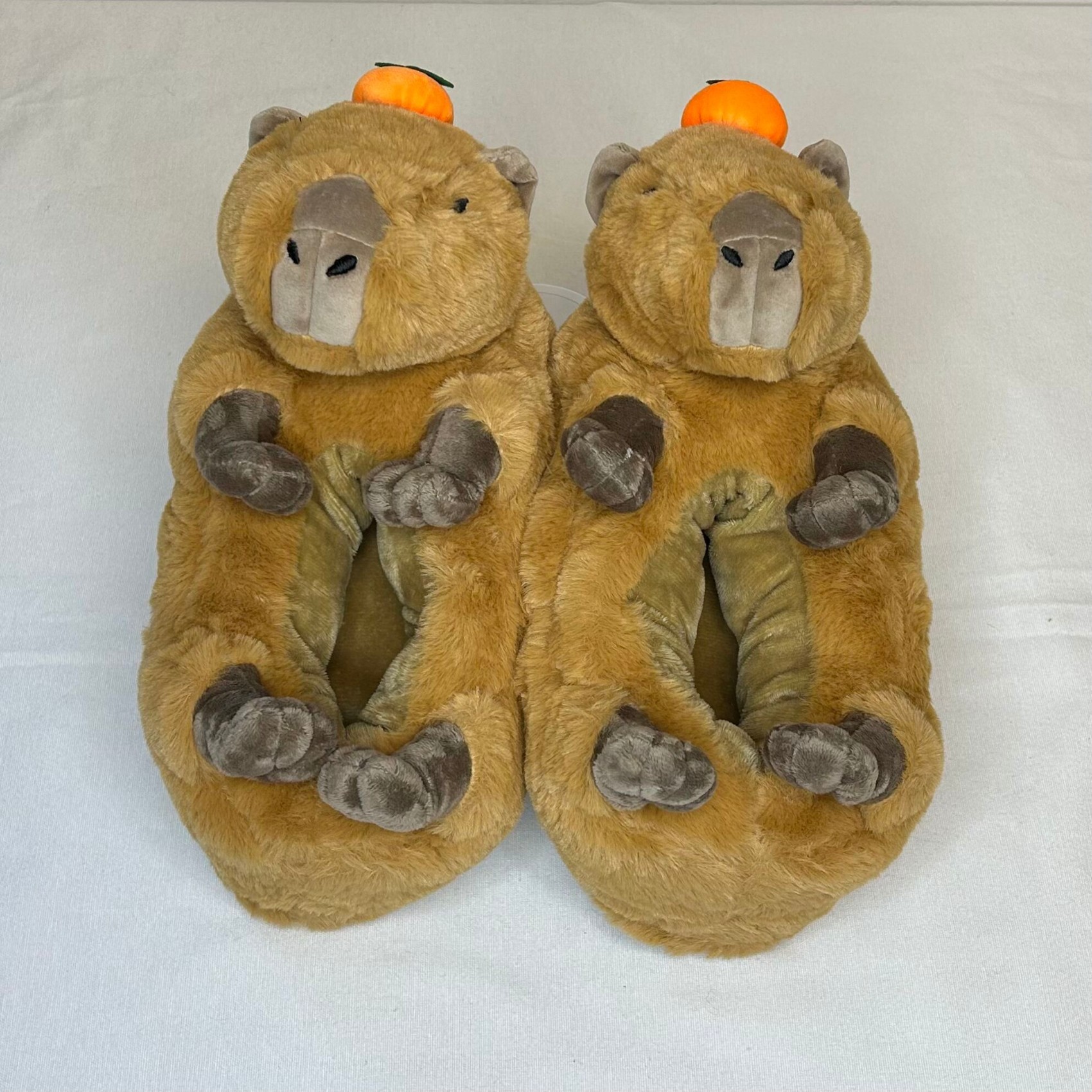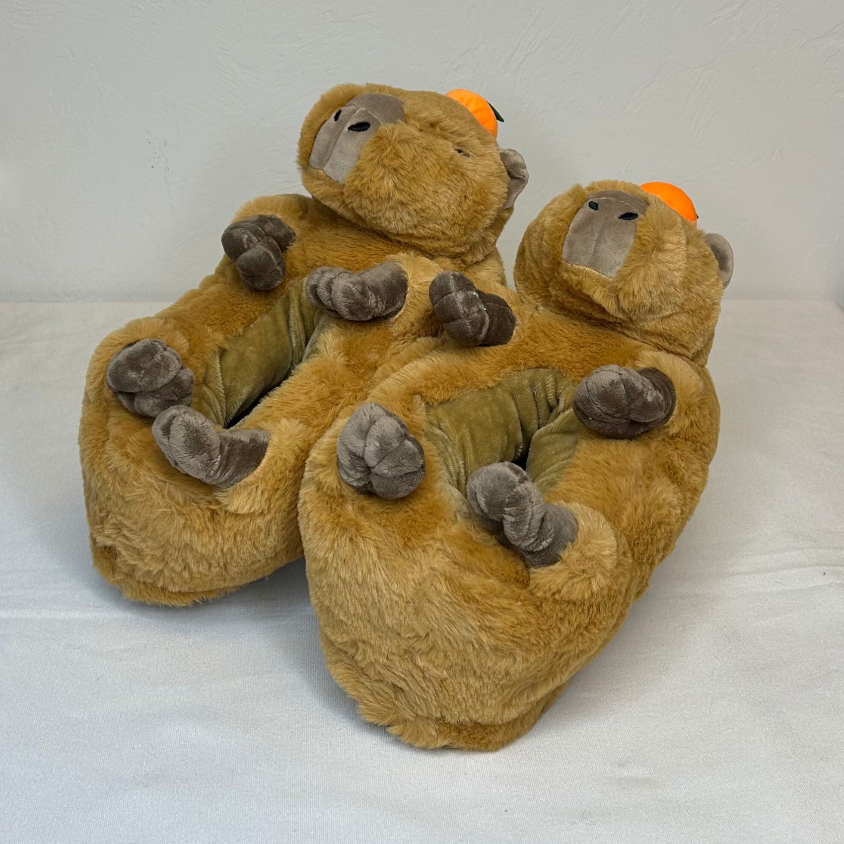 Capybara slippers. Capybara belly-up. Head with orange on top on toe area. Women’s shoe size 7 to 8, and men’s shoe size 5.5 to 6.5