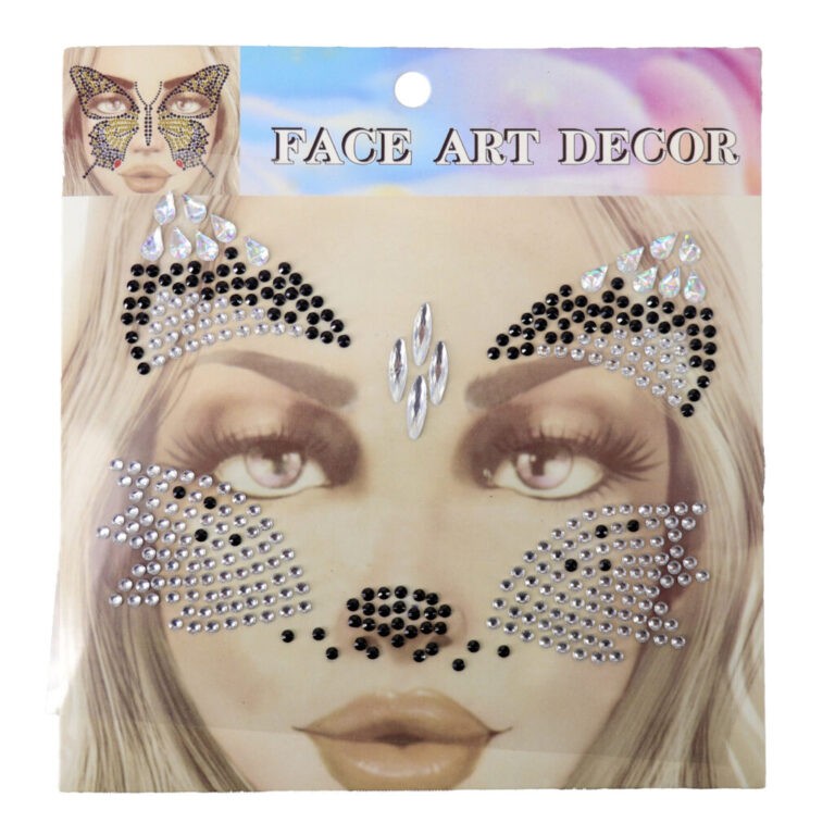 Cat inspired face gems featuring black and silver gems arranged in cat ears above the eyebrows. Sparking whisker accents on the cheeks and a bold black nose gems for a fierce feline vibe