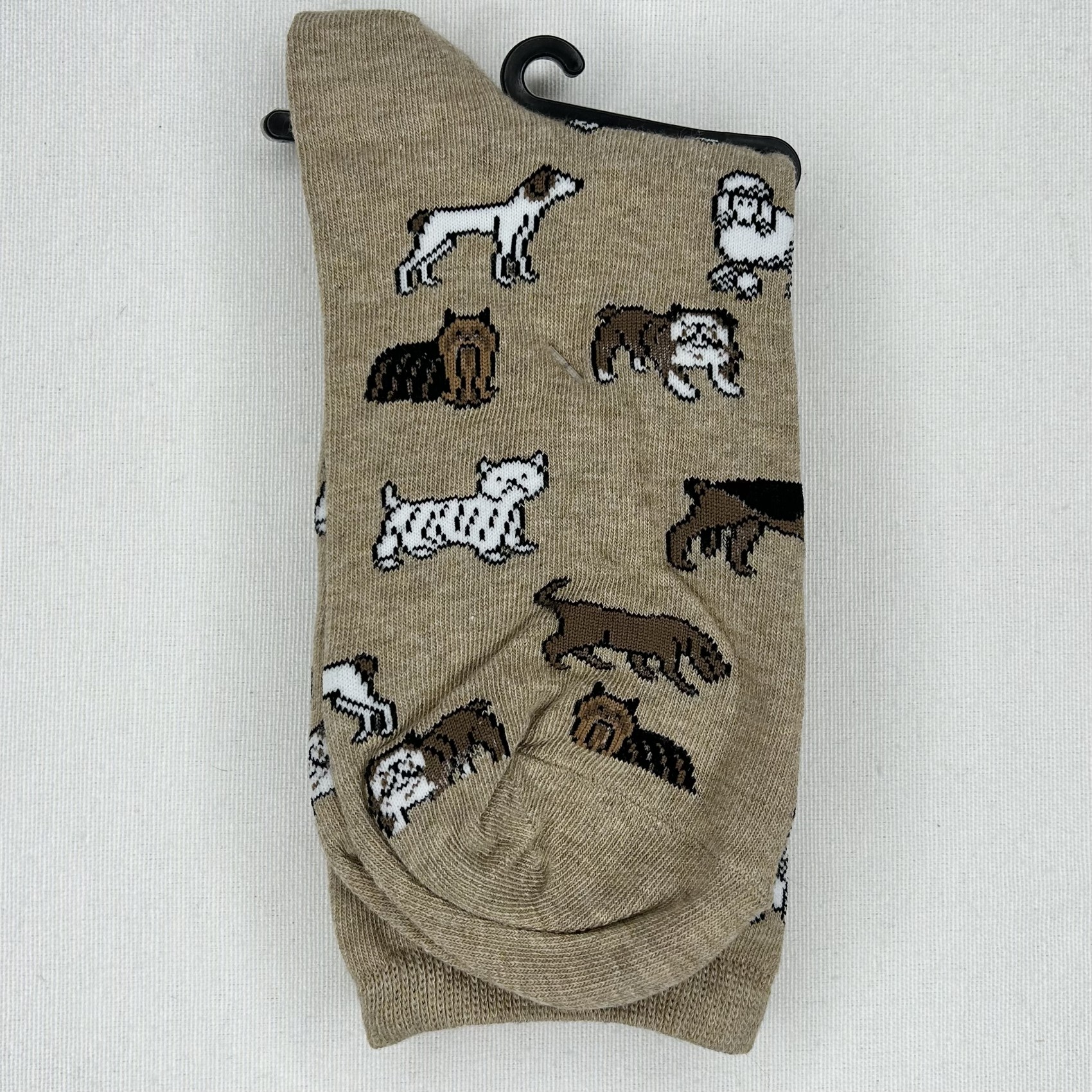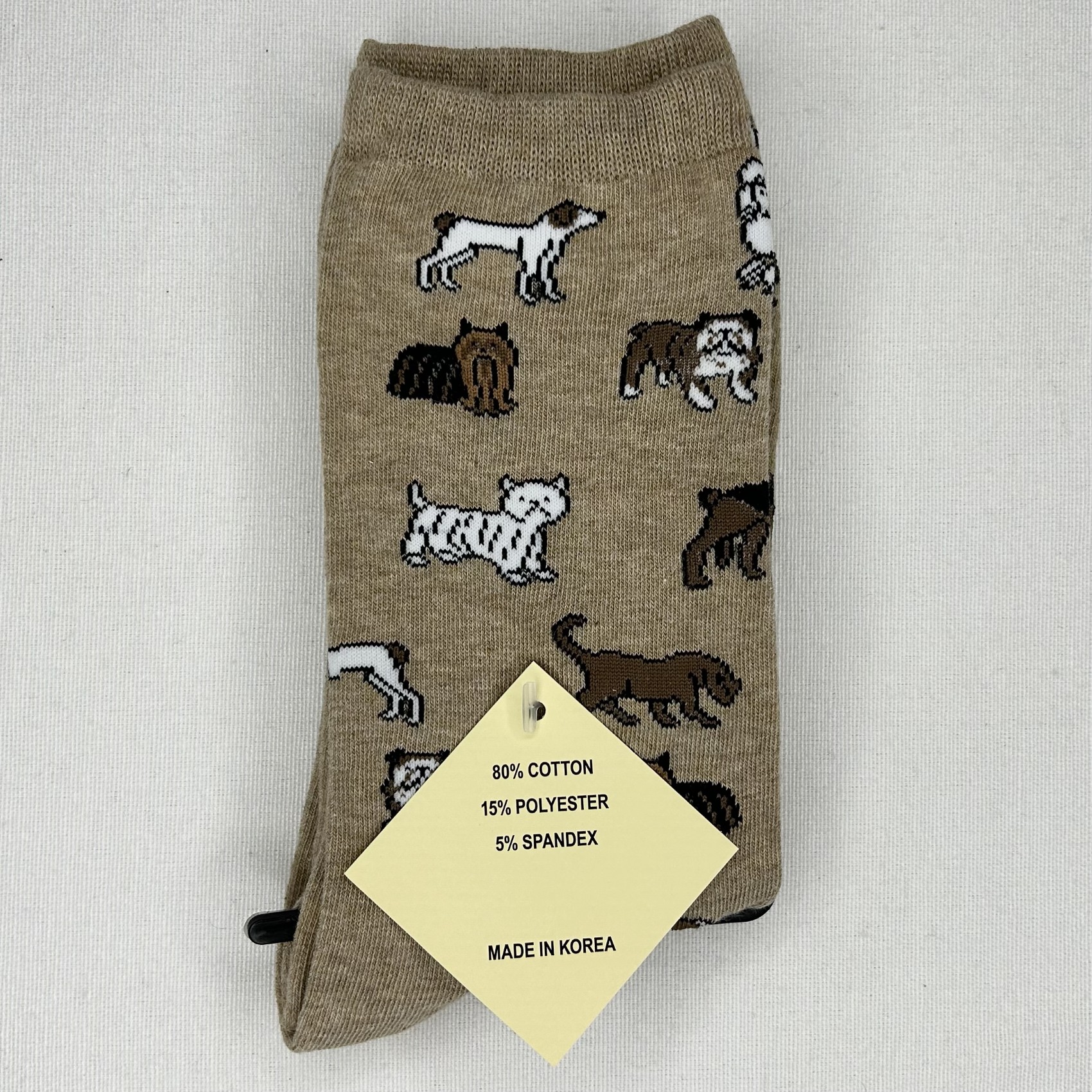 Light brown socks featuring a playful pattern of different dog breeds, fun cosy and stylish. 80% Cotton 15% Polyester 5% Spandex