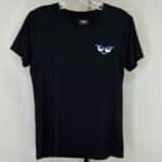 Fendi women’s black background short-sleeve T-shirt. Eyes with “FENDI” in yellow underneath. Slightly tapered from shoulders to waist. 100% cotton.