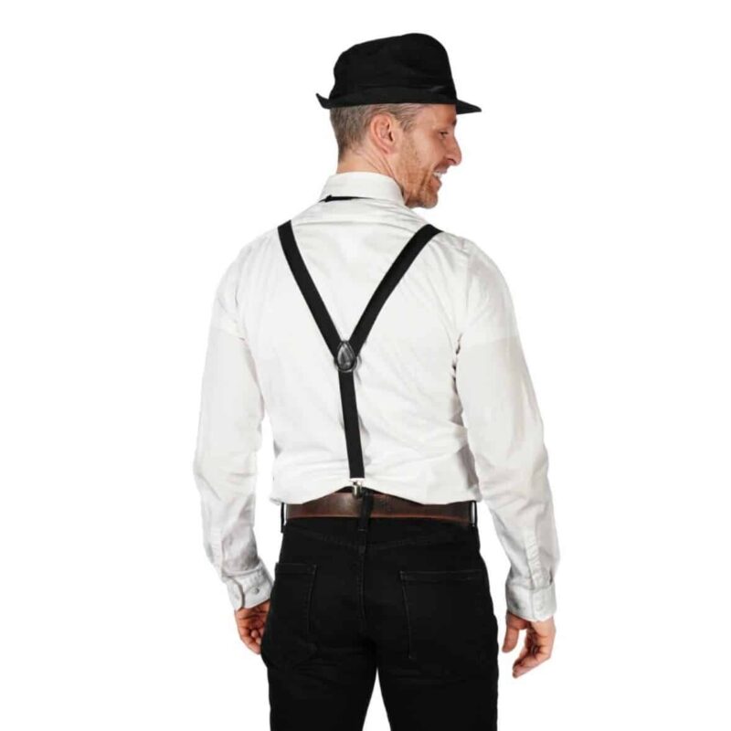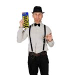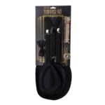 Men’s flapper accessories costume kit. Includes black fedora, black bowtie, faux cigar, black suspenders, six different stick-on mustaches, and pocketwatch.