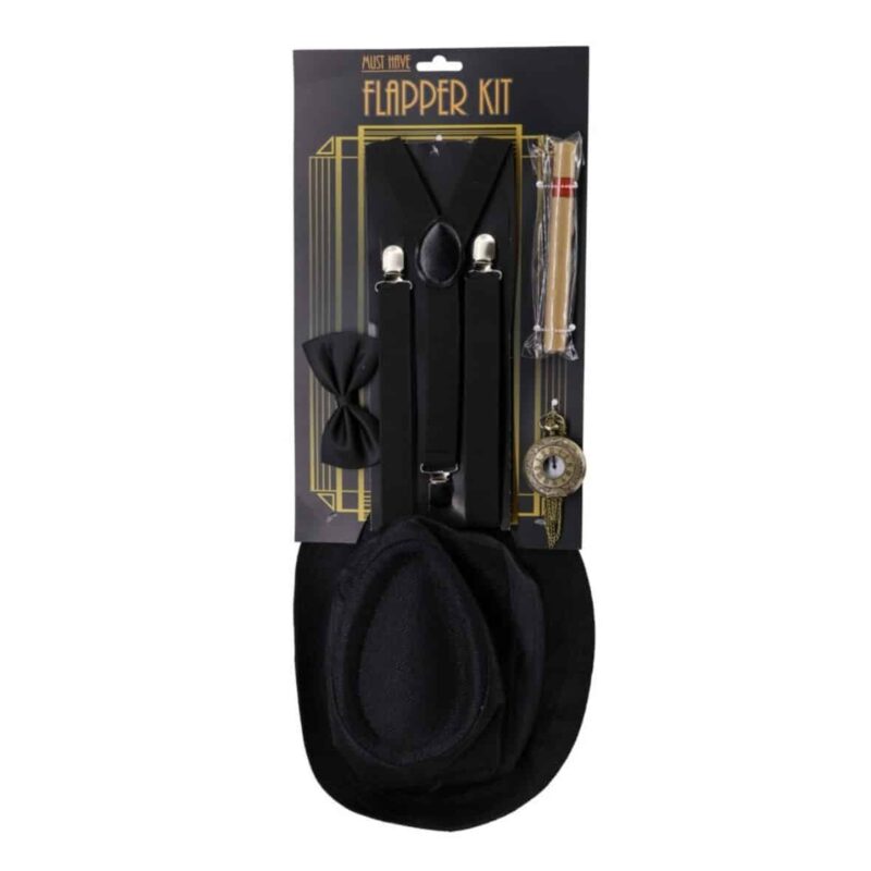 Men's flapper accessories costume kit. Includes black fedora, black bowtie, faux cigar, black suspenders, six different stick-on mustaches, and pocketwatch.