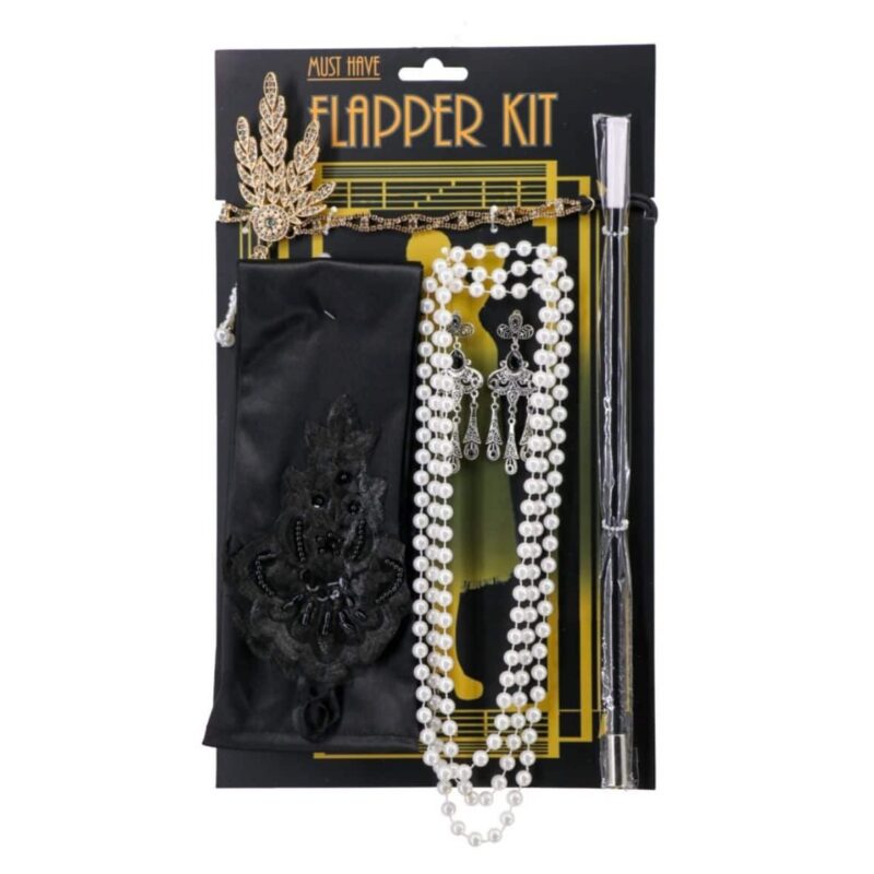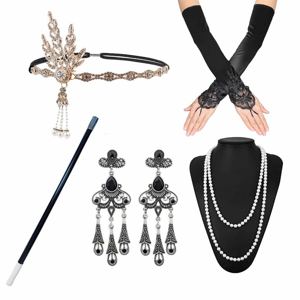 Women's flapper accessories costume kit. Includes embellished gloves, headband, pearl necklace, cigarette holder, and earrings.