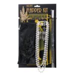 Women’s flapper accessories costume kit. Includes embellished gloves, headband, pearl necklace, cigarette holder, and earrings.