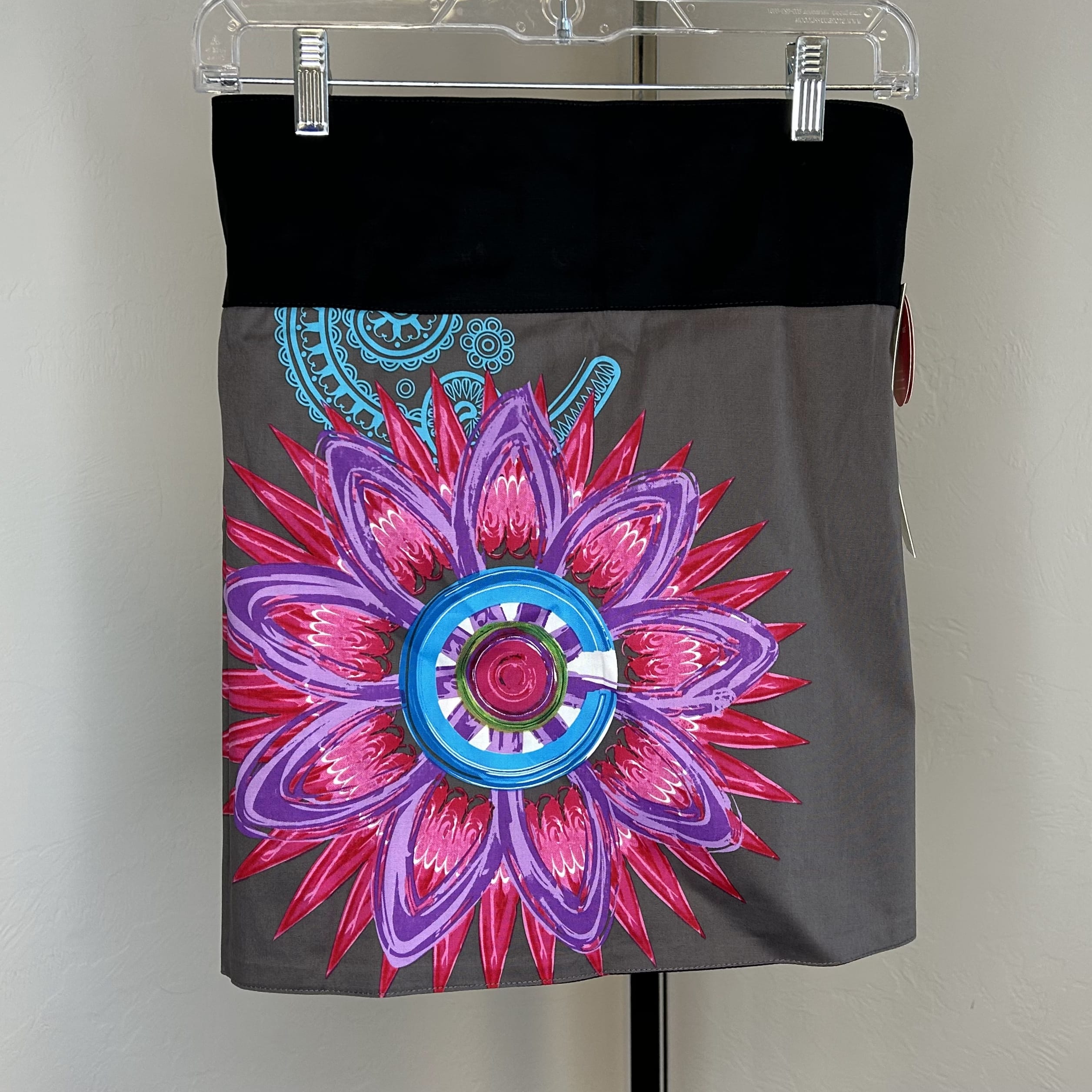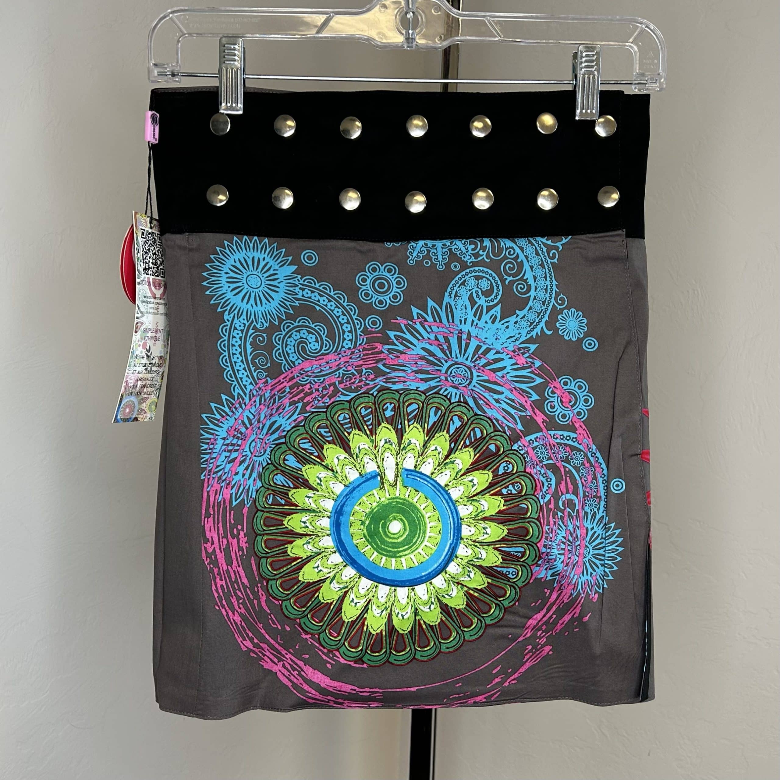 Coton Du Monde adjustable reversible snap skirt. Colorful medallions and floral motifs on both sides. Gray skirt, black waistband on one side, black skirt, gray waistband on the other. Waist: 33"-46". About 1.5" between snaps. 97% cotton 3% spandex.