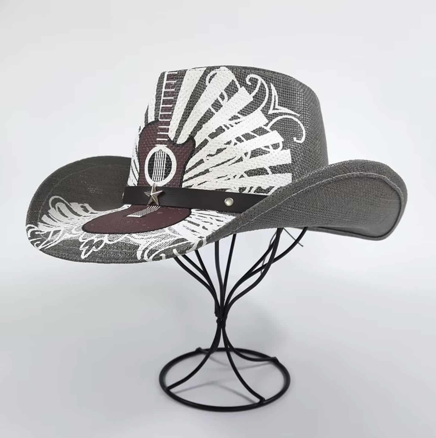 Gray Woven Cowboy Hat With Guitar Art
