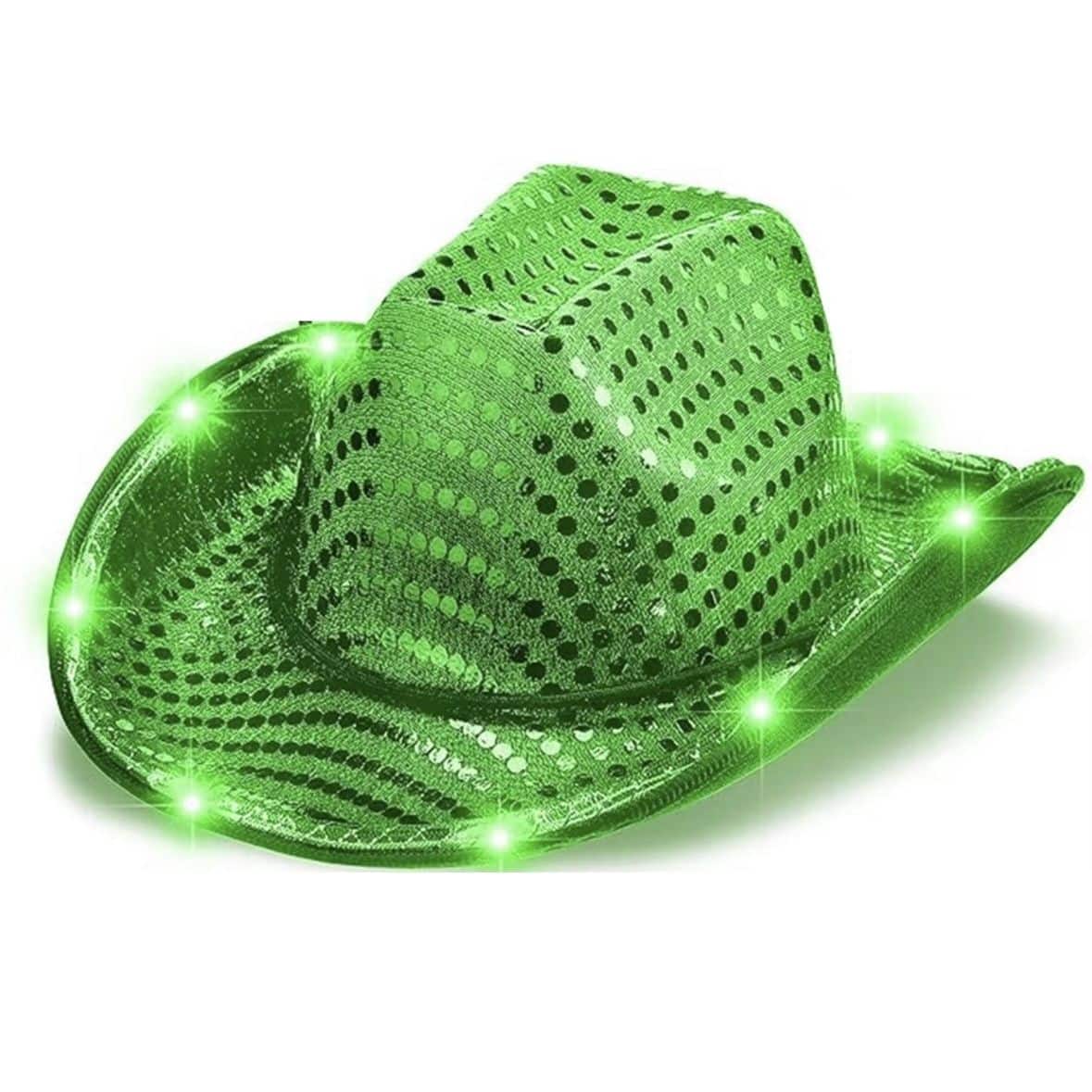 Green cowboy hat. Green shiny sequin dots. Black under-chin adjustable cord. Light up string along brim.