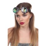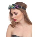 Kaleidoscope goggles. Color: rainbow ombre with main shades being green and purple/pink. Adjustable black elastic strap.