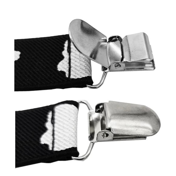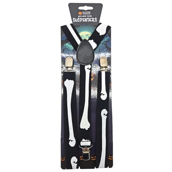 These adult-sized Halloween black with white bone print elastic suspenders are the perfect accessory for adding a spooky, skeletal touch to any Halloween ensemble. Featuring a striking white bone print on a black background, these suspenders offer a bold and eerie look. The elastic design ensures a comfortable fit for most sizes, making them ideal for Halloween parties, costume events, or adding a gothic flair to everyday outfits. Durable and stylish, these suspenders are a must-have for completing any bone-chilling costume.