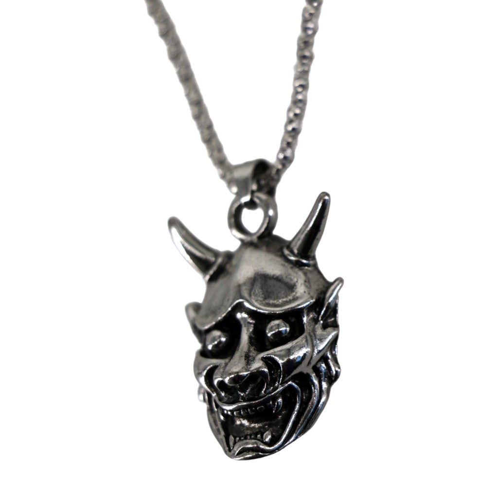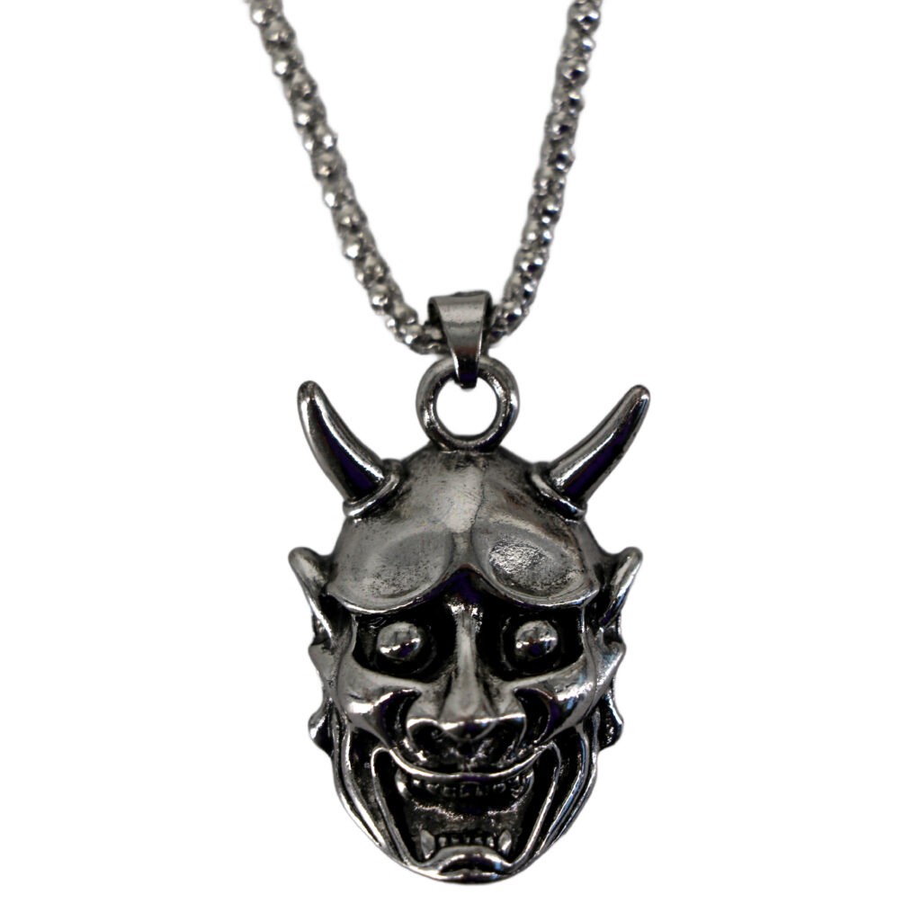 A striking silver necklace featuring a devil inspired pendant with two sharp horns on its head and small pointed teeth lining its mouth. The design has an intricate fierce look reminiscent of traditional mask art, making it a bold statement piece.