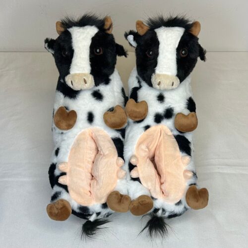 Cow slippers. Black and white cow belly-up with head on toe area. Women’s shoe size 7 to 8, and men’s shoe size 5.5 to 6.5.