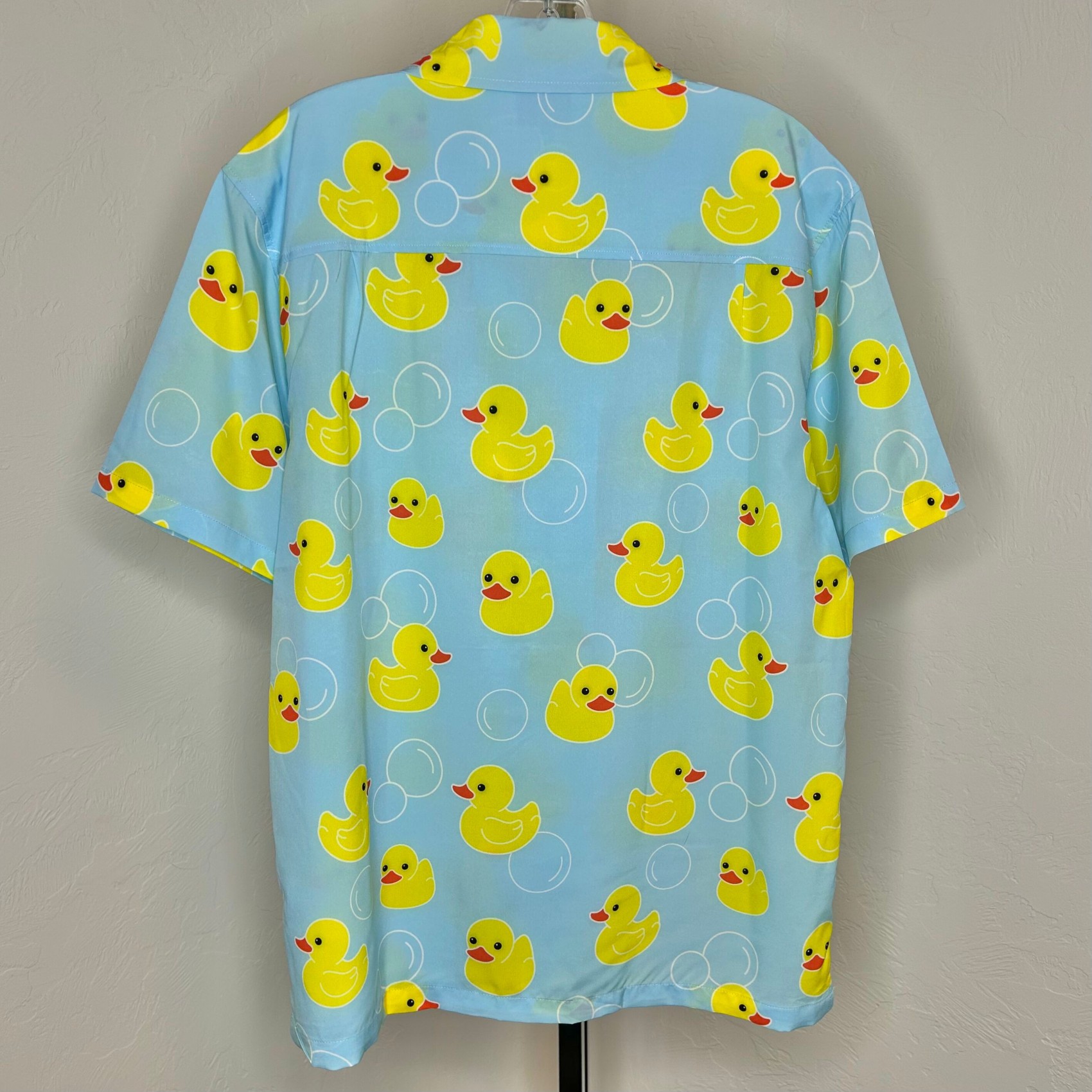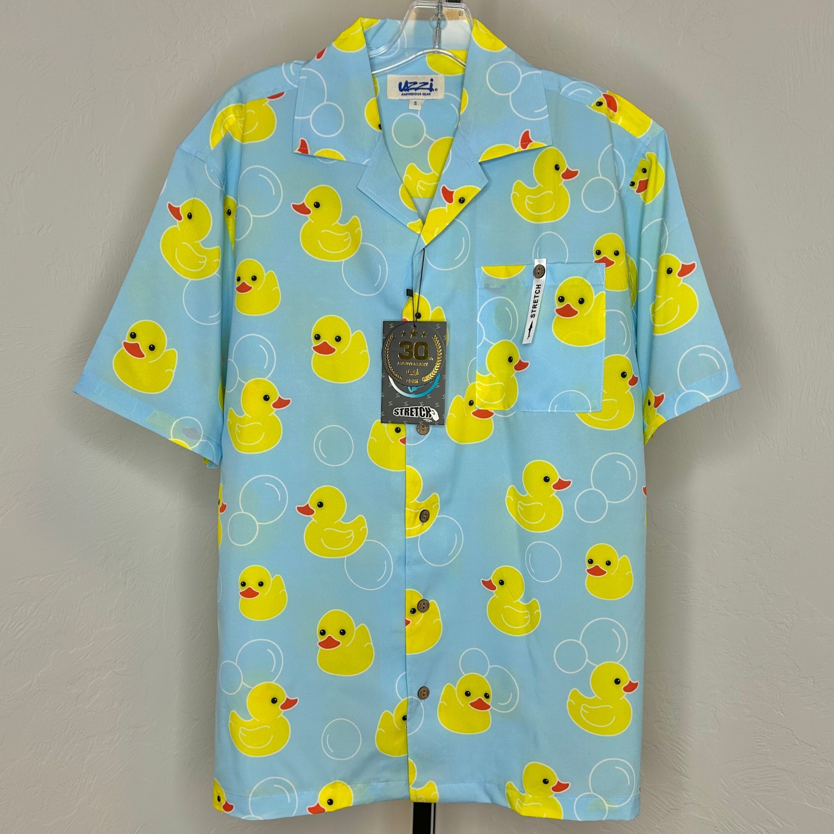 Uzzi Amphibious Gear light blue background short-sleeve button-up shirt. Yellow rubber ducks with orange beaks. White outlines of bubbles. Wood-like “UZZI”-engraved buttons. 95% polyester, 5% spandex.