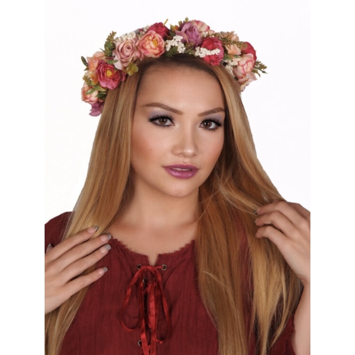 Vine style headband featuring a blend of red, peach, and purple roses intertwined with a mix of green vines and floral accents for a soft, whimsical garden look.