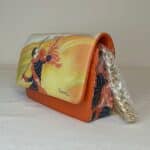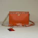 Orange ICON crossbody bag. Printed Leonetto Cappiello golf print on top flap. Blue, green, and orange design along side and bottom. Golden chain strap with an adjustable leather buckle accent. Golden hardwear stamped "ICON". Many internal pockets. Stamped Genuine Leather.