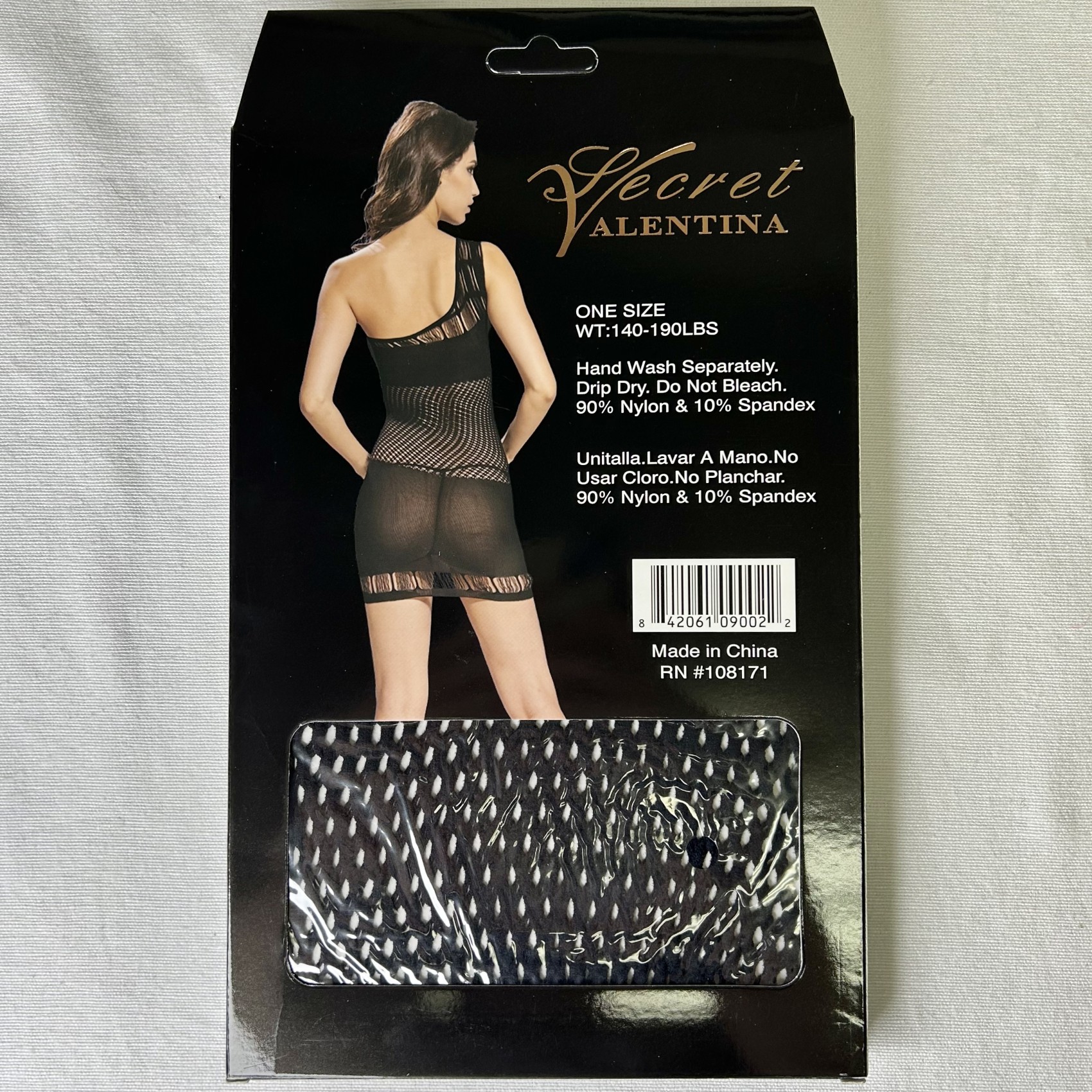 Striking fishnet dress with a slip-on shoulder strap featuring fine netting at bust and hip, contrasted by bold open net panels at the waist for a show stopping silhouette.