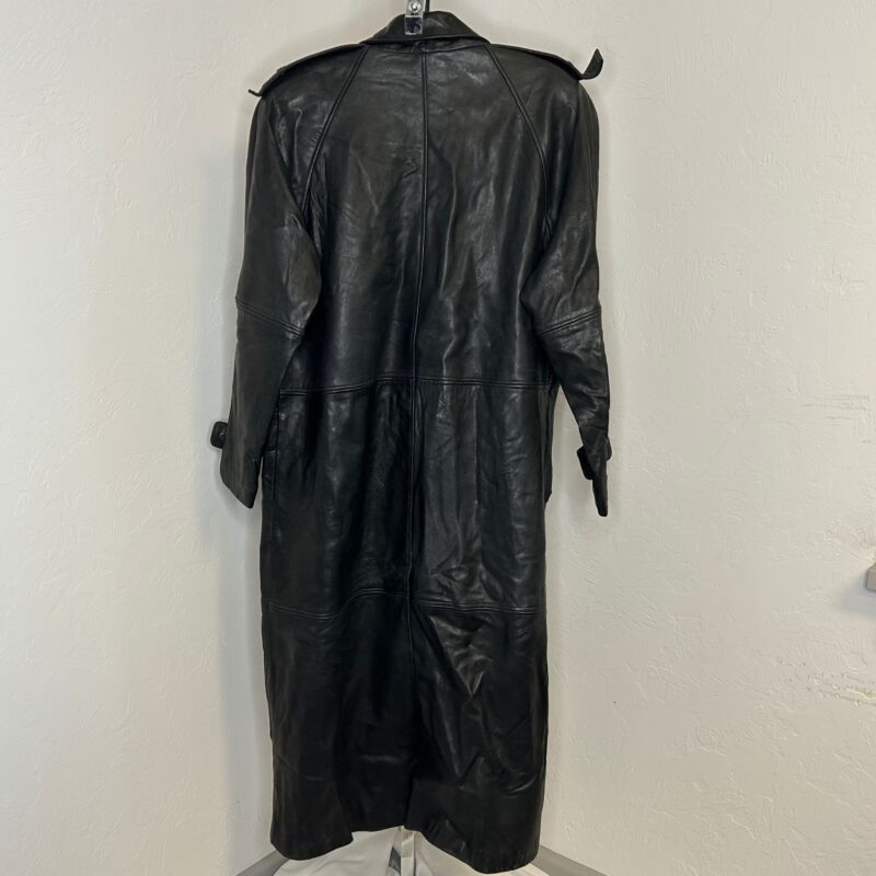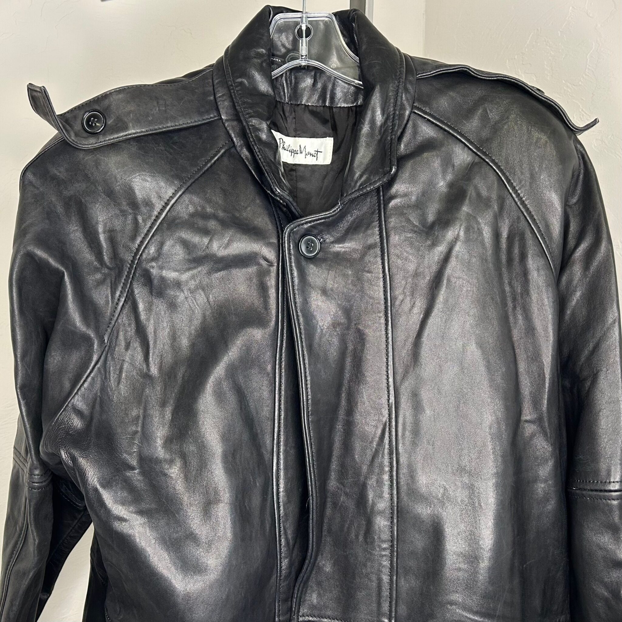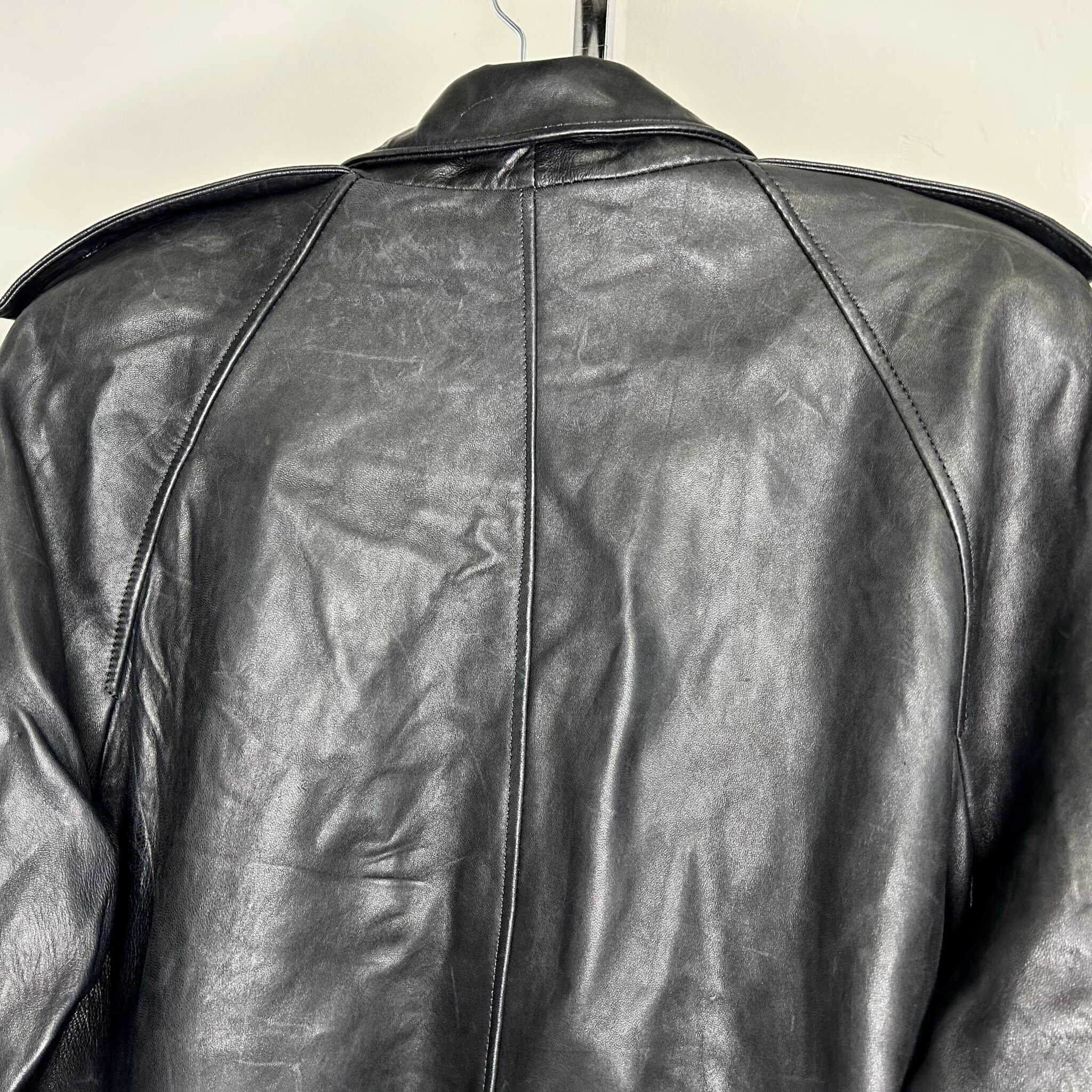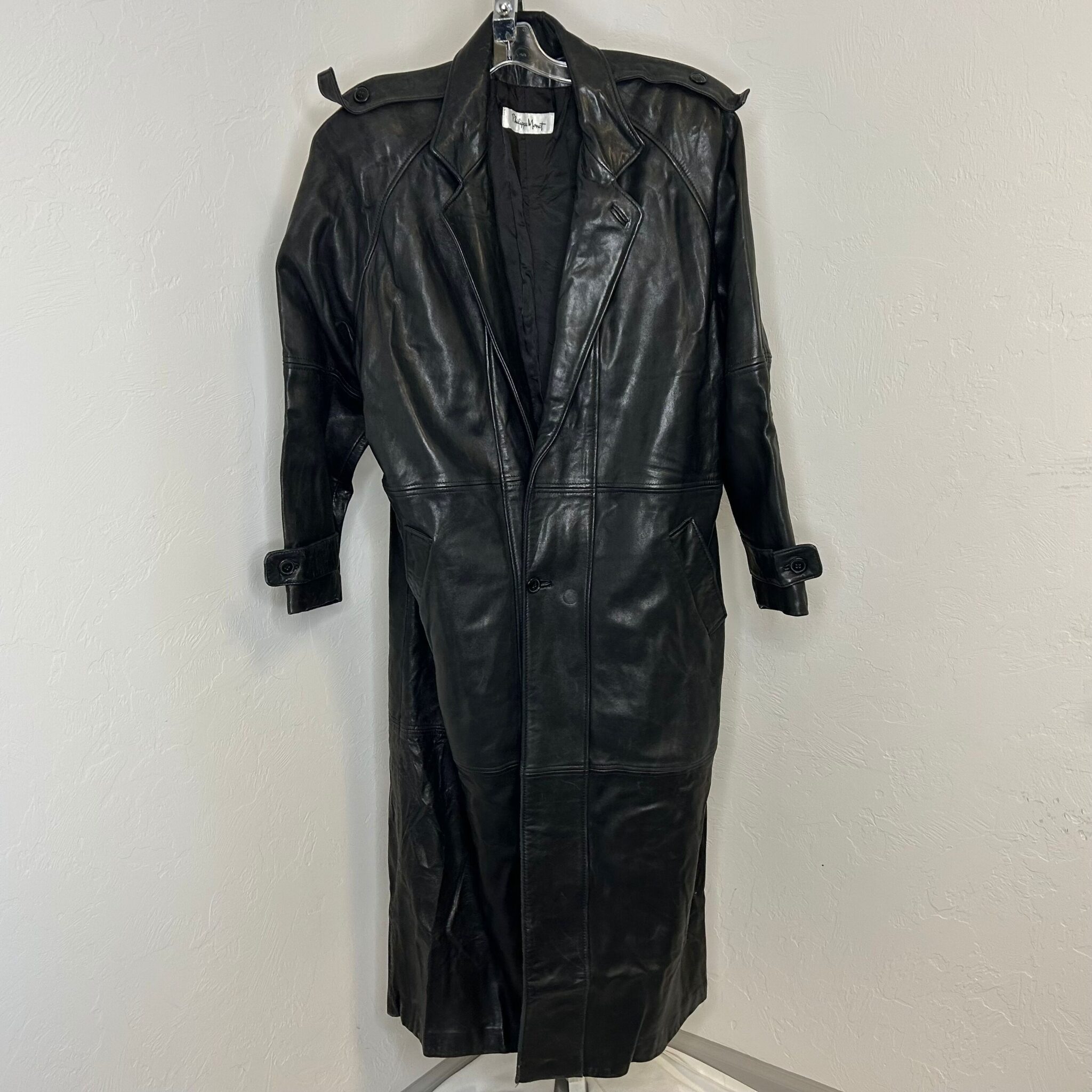 Philippe Monet black long leather trench coat. Shoulder pads with strap and button accent to create a broad shoulder silhouette. Strap and button detail on sleeve cuffs. Internal pockets. Size 40. Shell genuine leather, lining 50% nylon and 50% acetate. made in Korea.