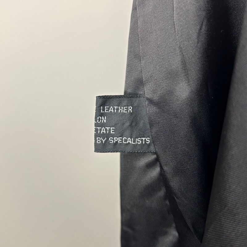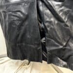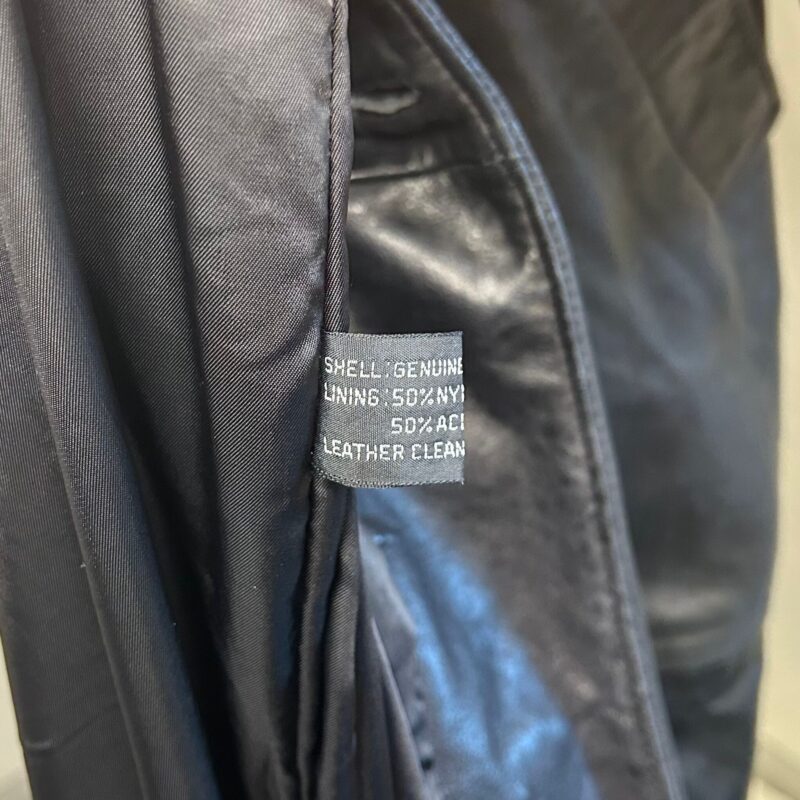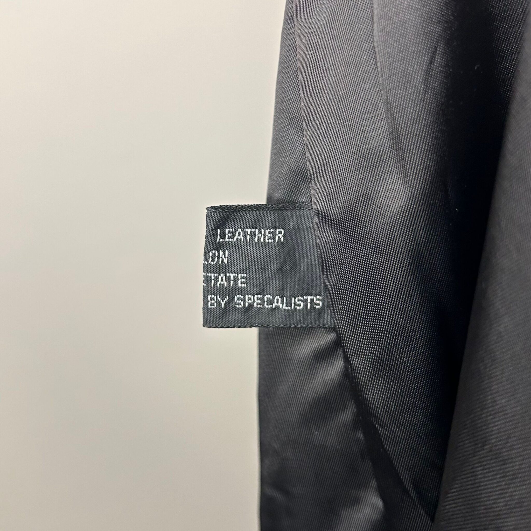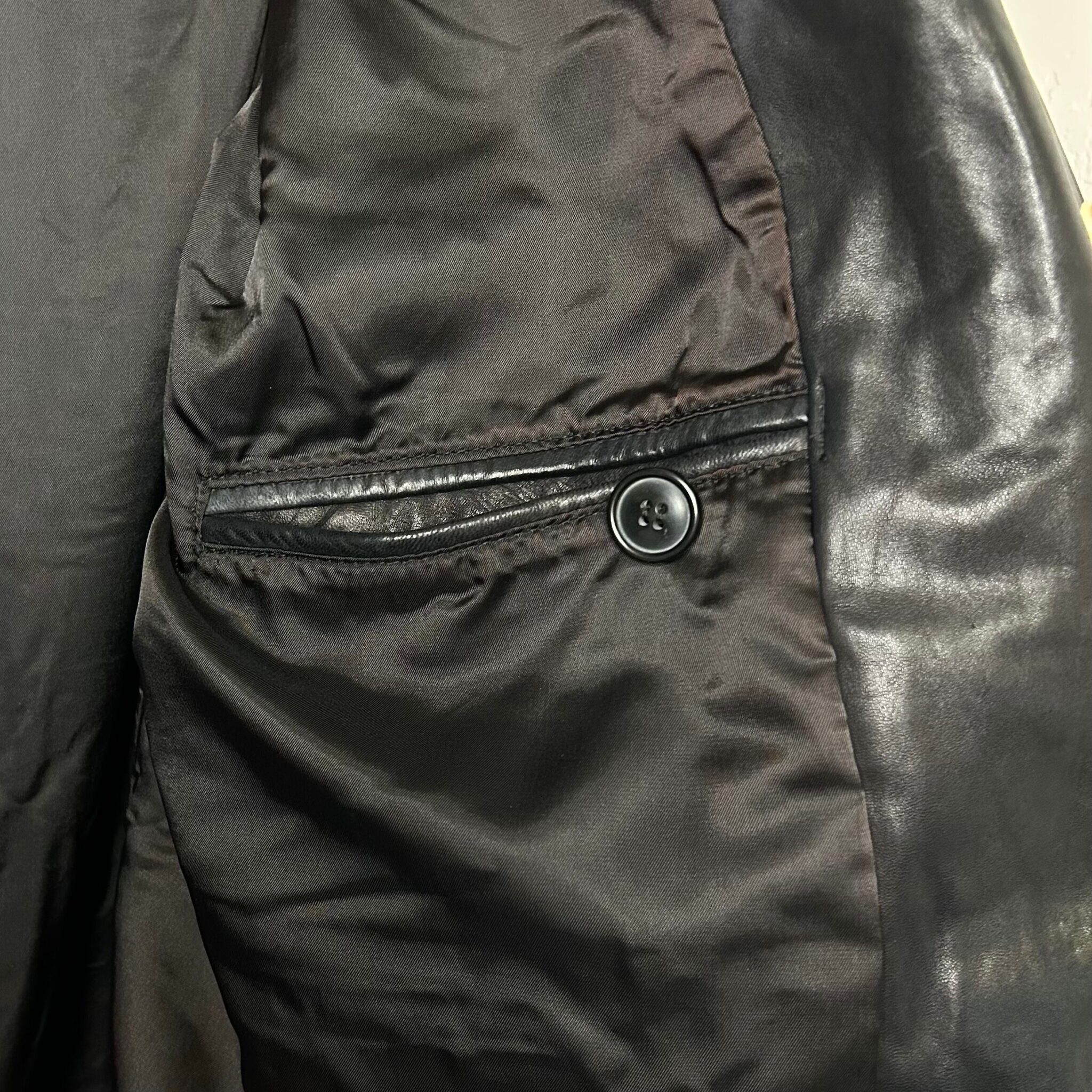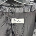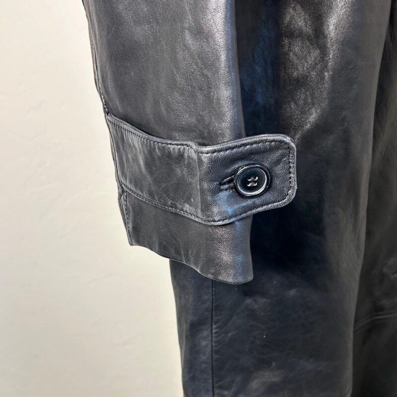 Philippe Monet black long leather trench coat. Shoulder pads with strap and button accent to create a broad shoulder silhouette. Strap and button detail on sleeve cuffs. Internal pockets. Size 40. Shell genuine leather, lining 50% nylon and 50% acetate. made in Korea.