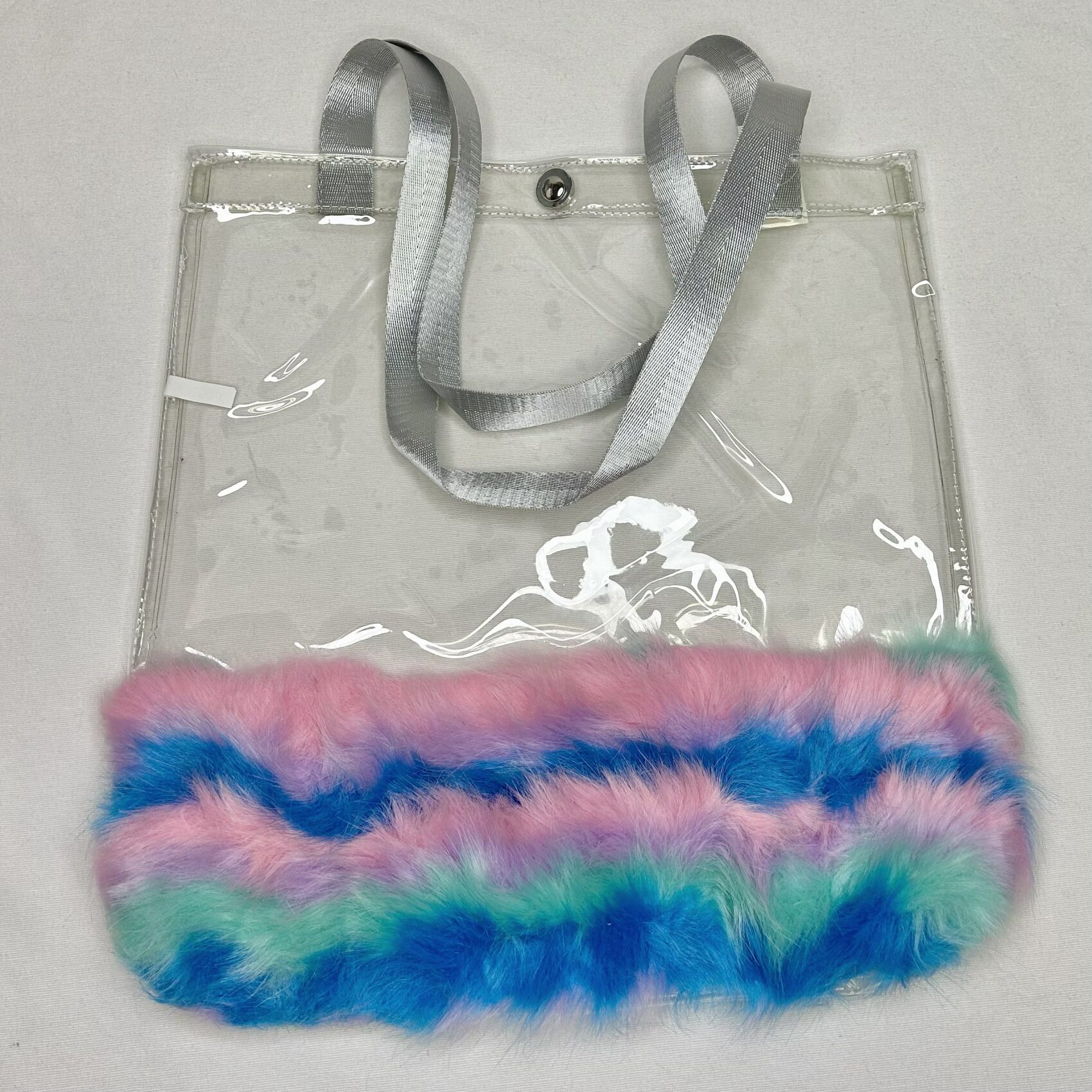 Clear tote bag featuring a bold rainbow faux fur bottom for festivals or just everyday flair.