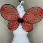 Red ladybug wings with black trim. Black and Sparkly gold dots all over. Black elastic shoulder straps.