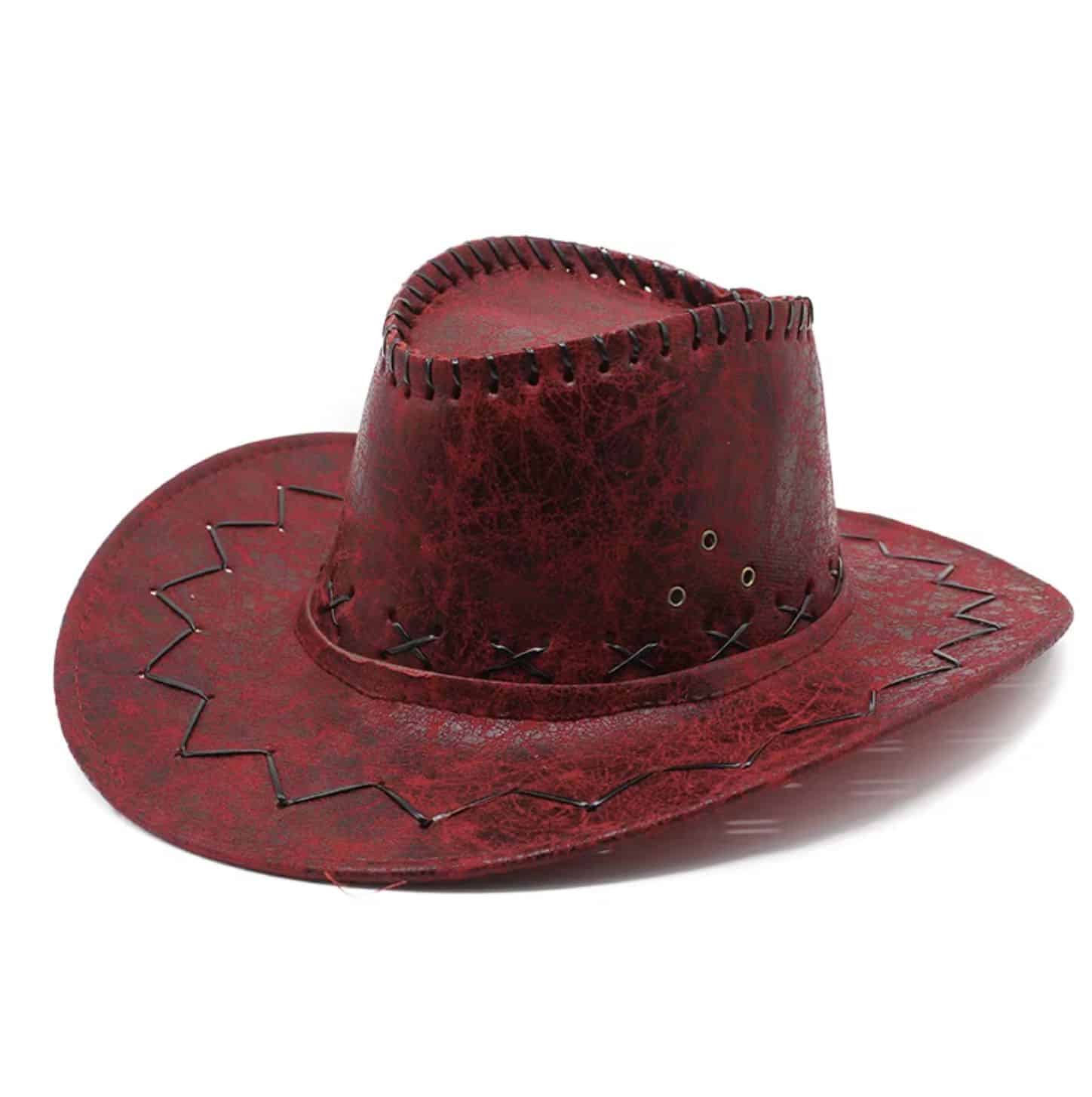 Red faux leather cowboy hat. Black zigzag stitching along brim, x stitching along crown, and stitching along top of brim. Three golden eyelets on each side of crown. Adjustable black chin strap.