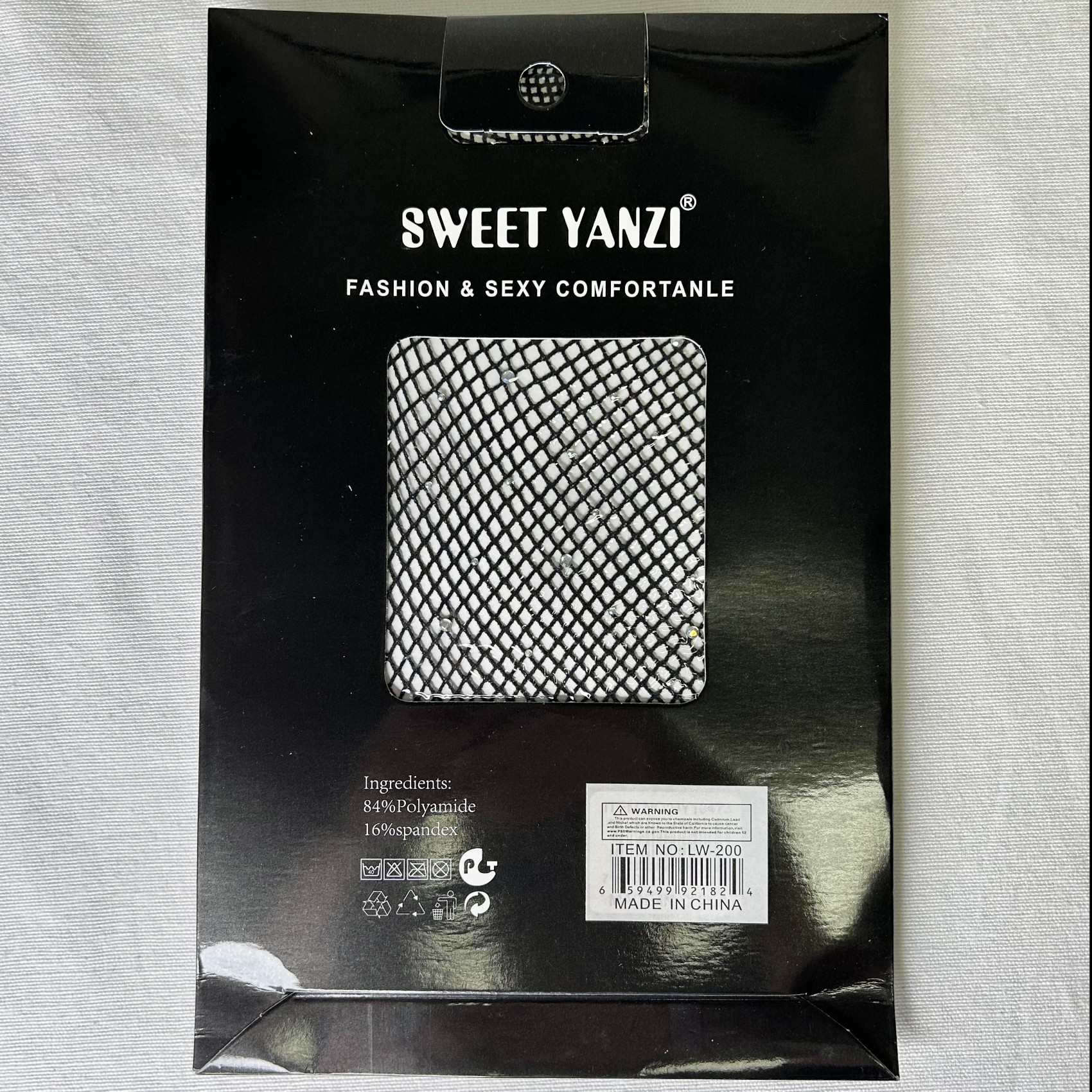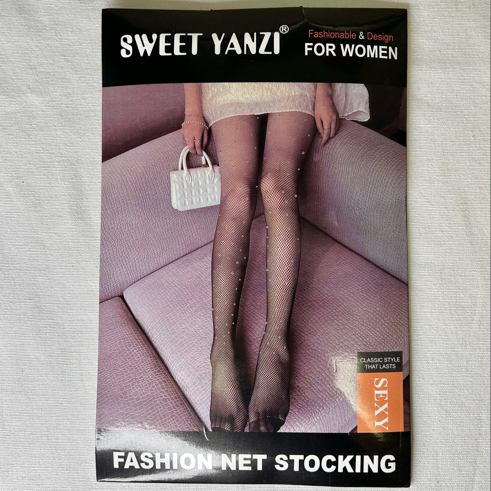 Black fishnet pantyhose adorned with small rhinestones for a sparkling, glamorous touch that elevates any look.