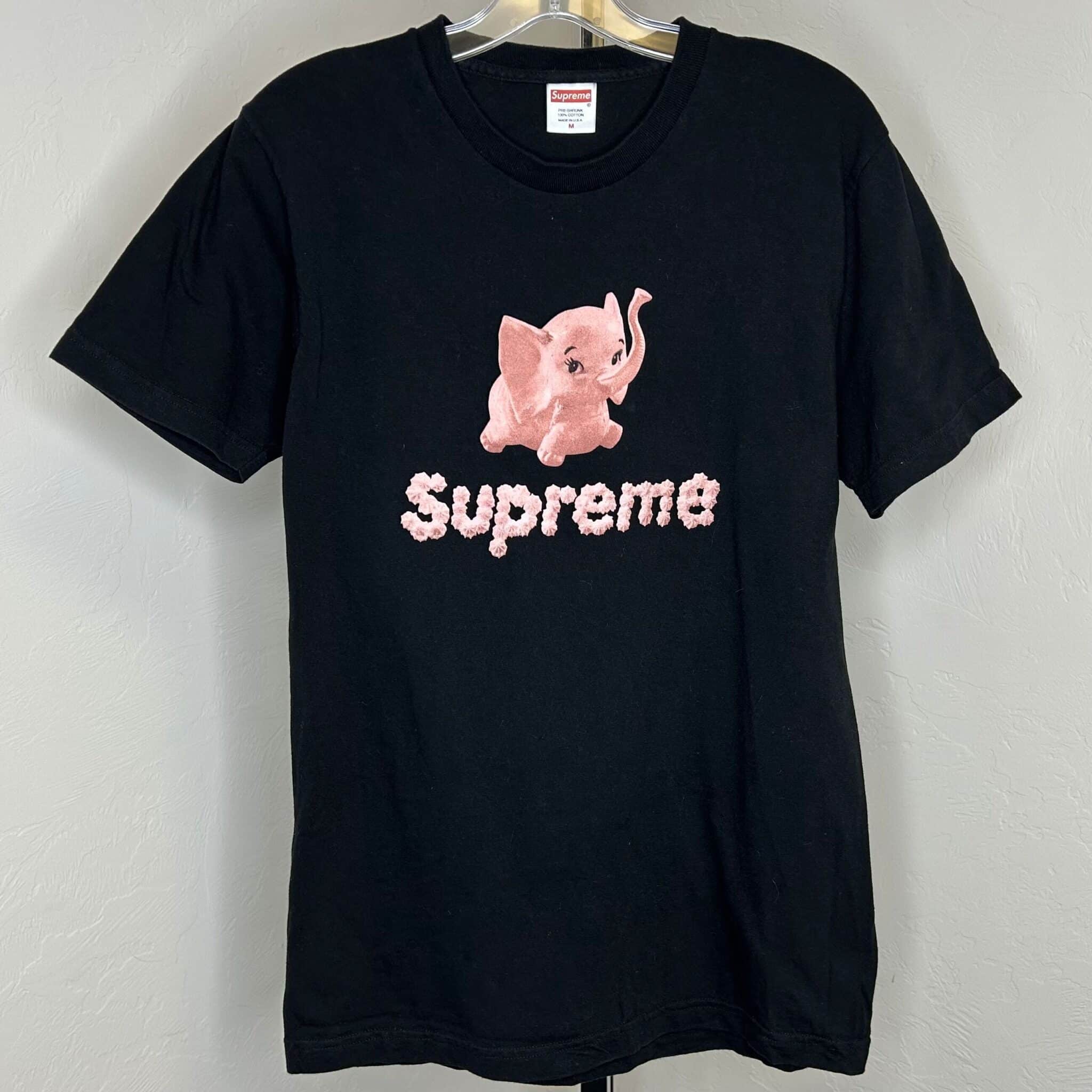 Supreme black background short-sleeve T-shirt. Printed pink elephant and “Supreme” made out of meringues. 100% pre-shrunk cotton.