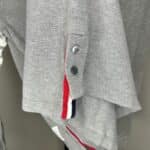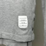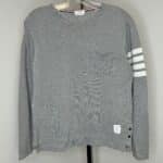 Thom Browne gray women’s long-sleeve shirt. Left front breast pocket. Four white stripes on upper part of left sleeve. Classic Thom Browne ribbing along inner collar and bottom of side seams. Two black pearlescent buttons at bottom of each side seam. Women’s size 1. Body: 100% cotton. Ribbing: 98% cotton, 2% nylon.