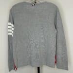 Thom Browne gray women's long-sleeve shirt. Left front breast pocket. Four white stripes on upper part of left sleeve. Classic Thom Browne ribbing along inner collar and bottom of side seams. Two black pearlescent buttons at bottom of each side seam. Women's size 1. Body: 100% cotton. Ribbing: 98% cotton, 2% nylon.