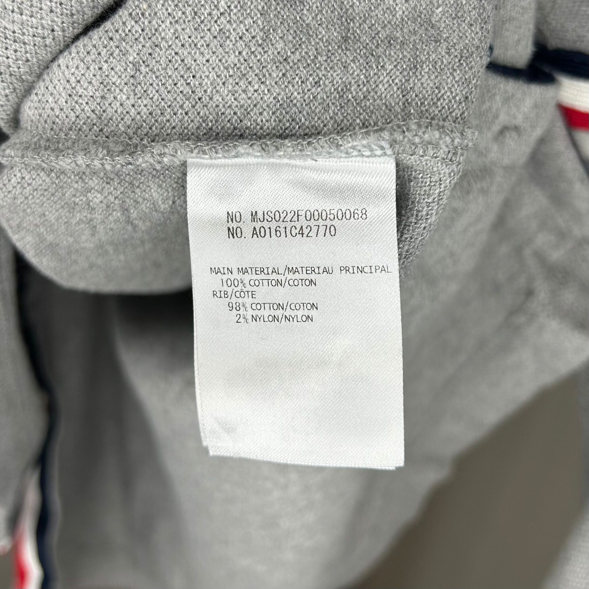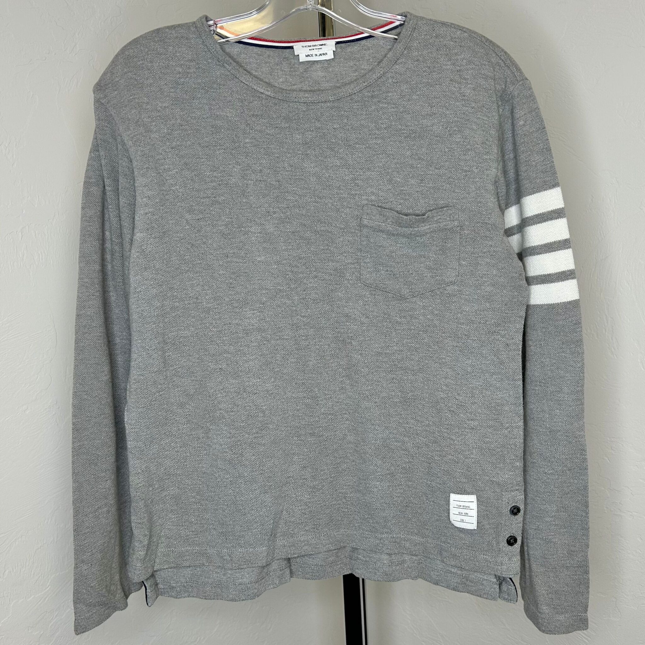 Thom Browne gray women’s long-sleeve shirt. Left front breast pocket. Four white stripes on upper part of left sleeve. Classic Thom Browne ribbing along inner collar and bottom of side seams. Two black pearlescent buttons at bottom of each side seam. Women’s size 1. Body: 100% cotton. Ribbing: 98% cotton, 2% nylon.
