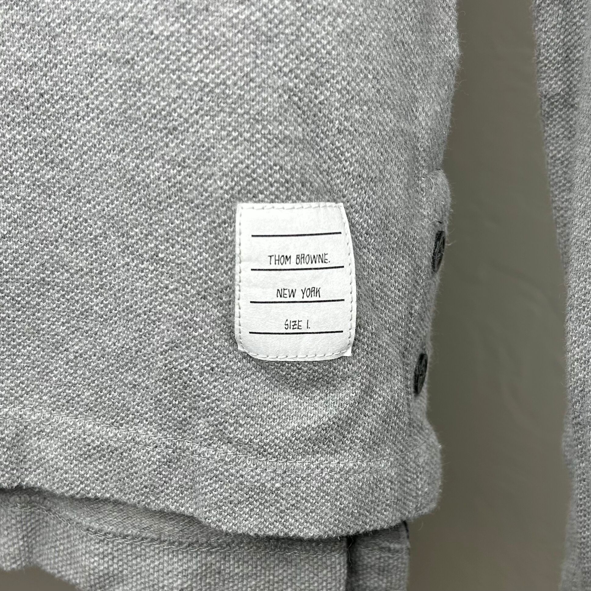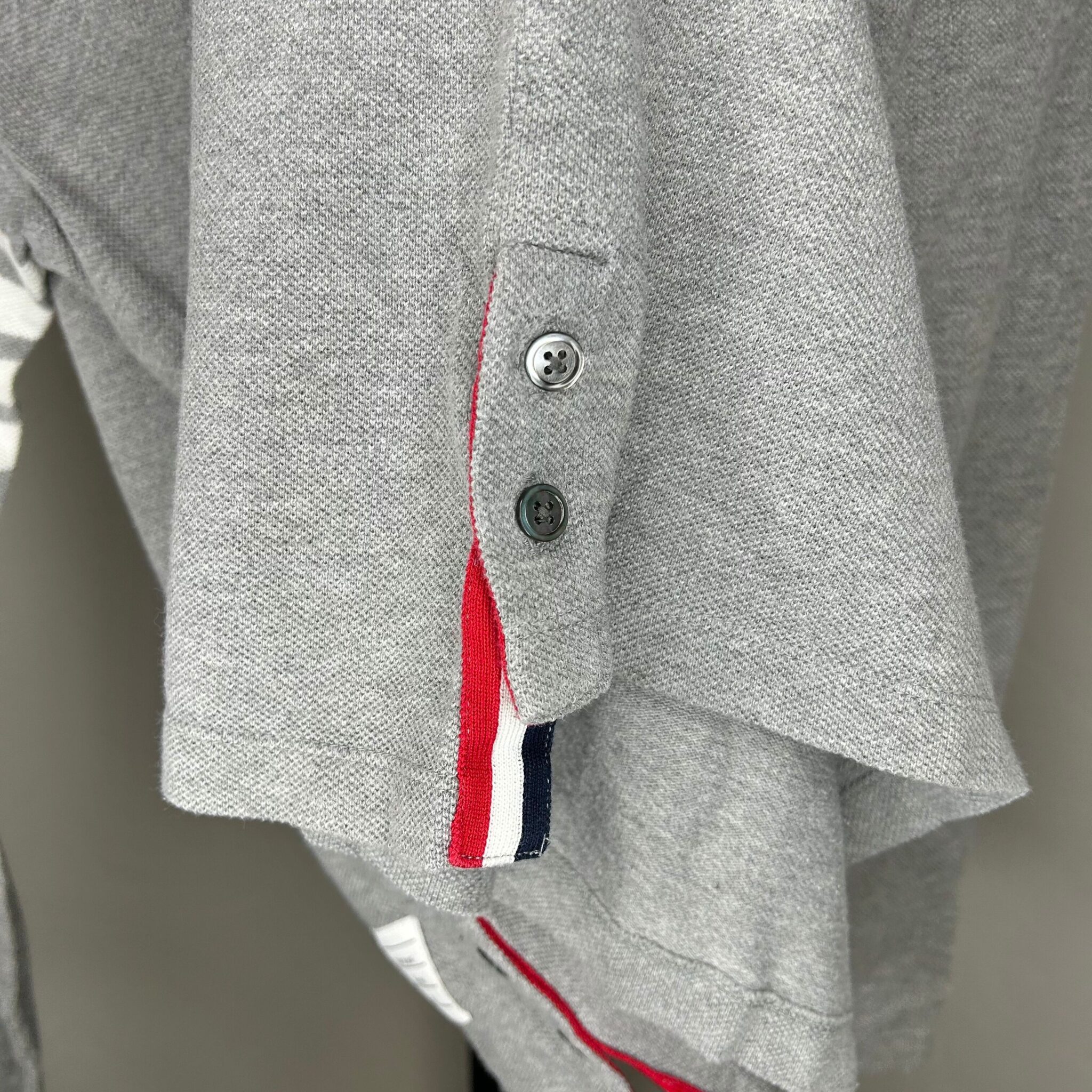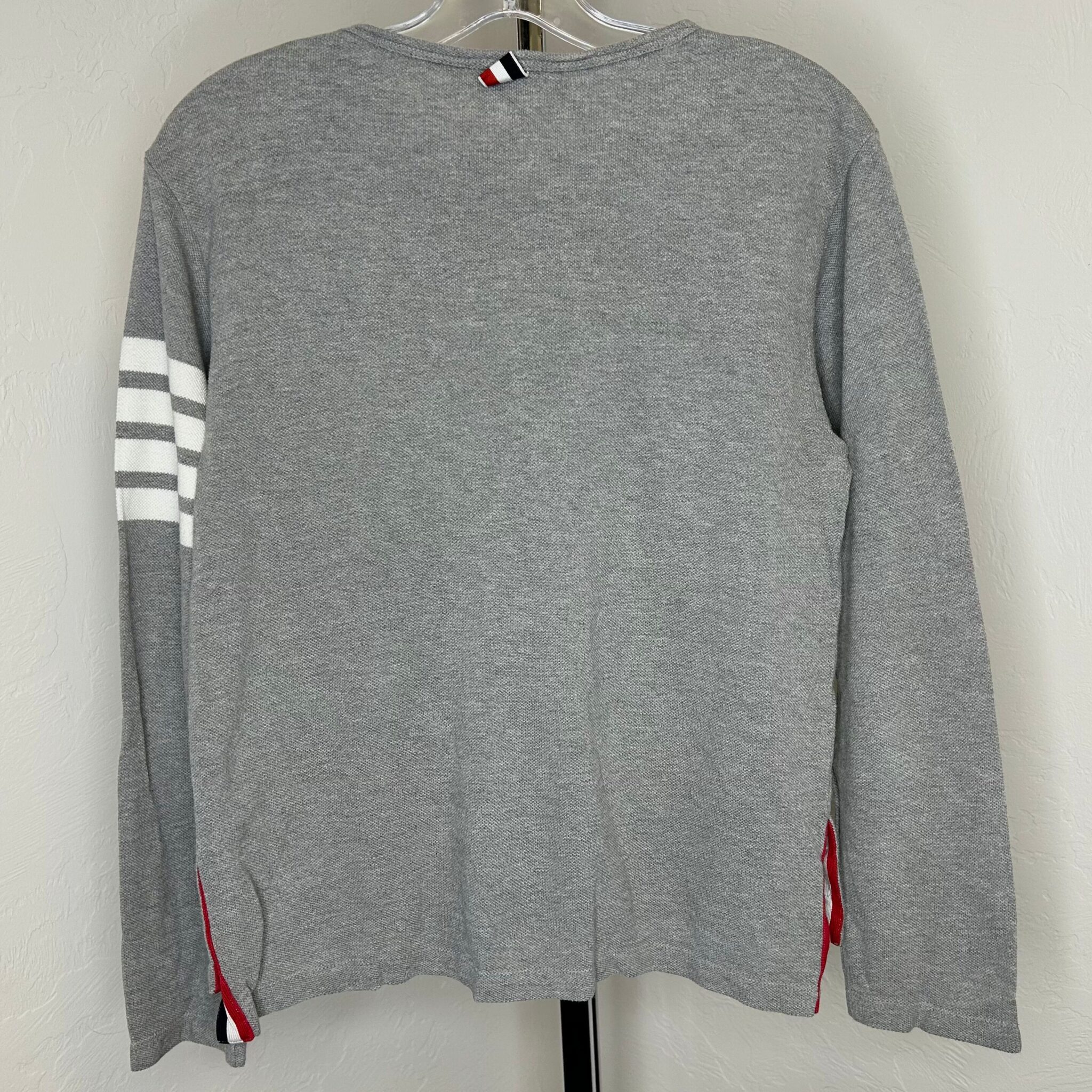 Thom Browne gray women's long-sleeve shirt. Left front breast pocket. Four white stripes on upper part of left sleeve. Classic Thom Browne ribbing along inner collar and bottom of side seams. Two black pearlescent buttons at bottom of each side seam. Women's size 1. Body: 100% cotton. Ribbing: 98% cotton, 2% nylon.