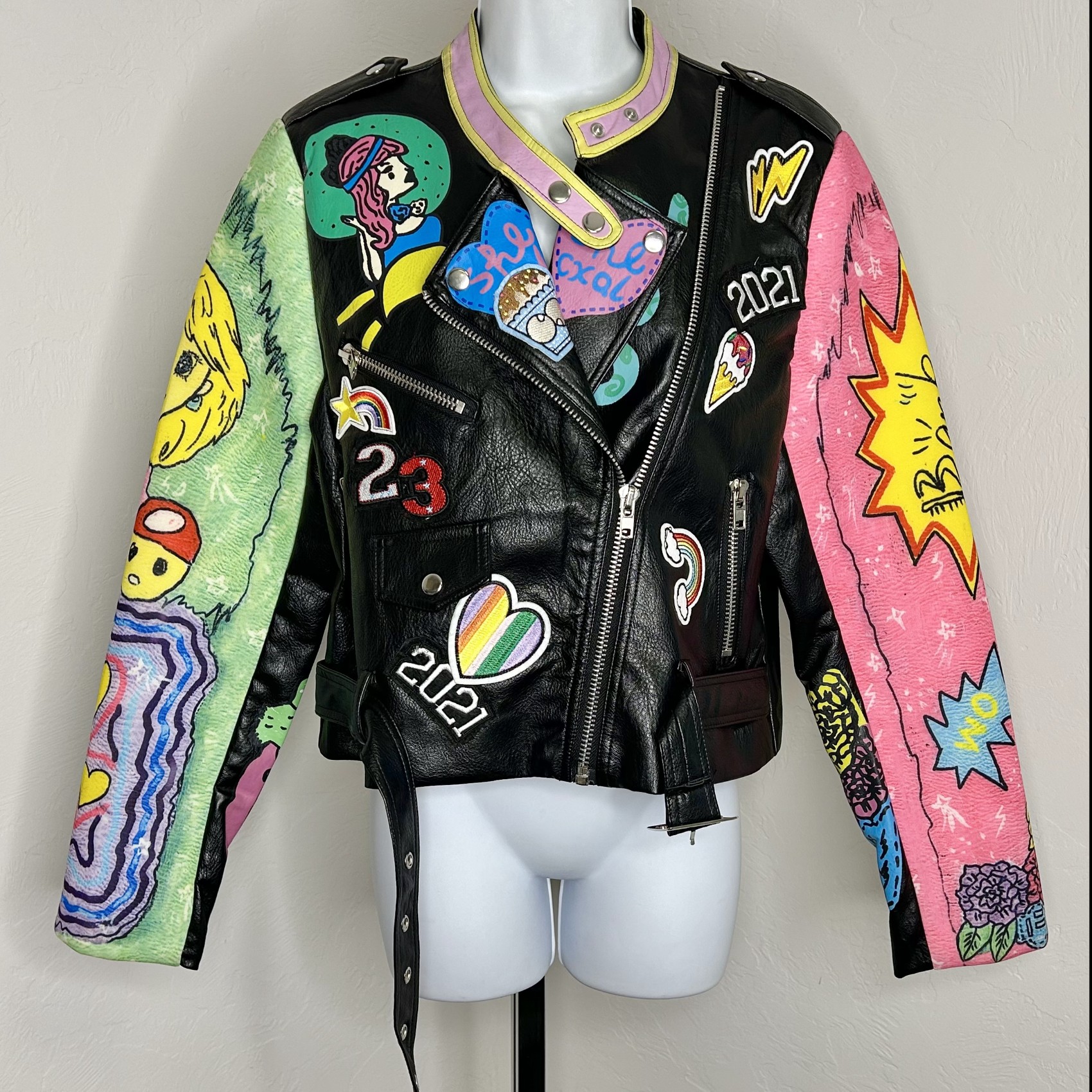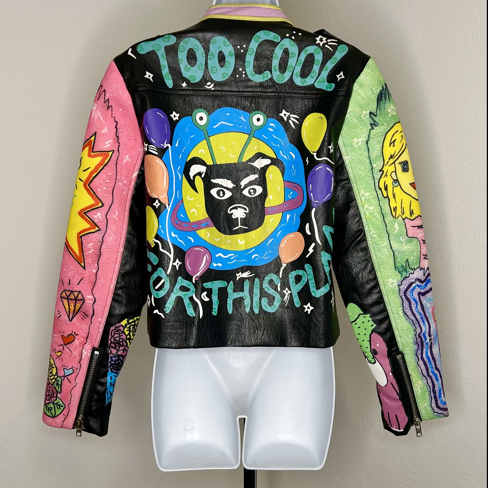 Black leather jacket with one pink sleeve and one green sleeve. On the back, a playful black dog with alien eyes takes center stage, surrounded by colorful floating balloons. Around the dog, the words, ‘Too Cool For This Planet’ add a quirky touch. The green sleeve features a simple artist drawing of a blonde women while the jacket is adorned with various cute, hand drawn designs for a fun, whimsical feel.
