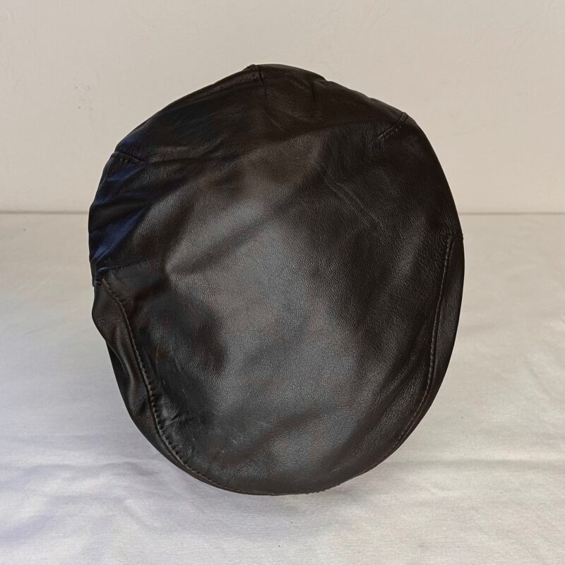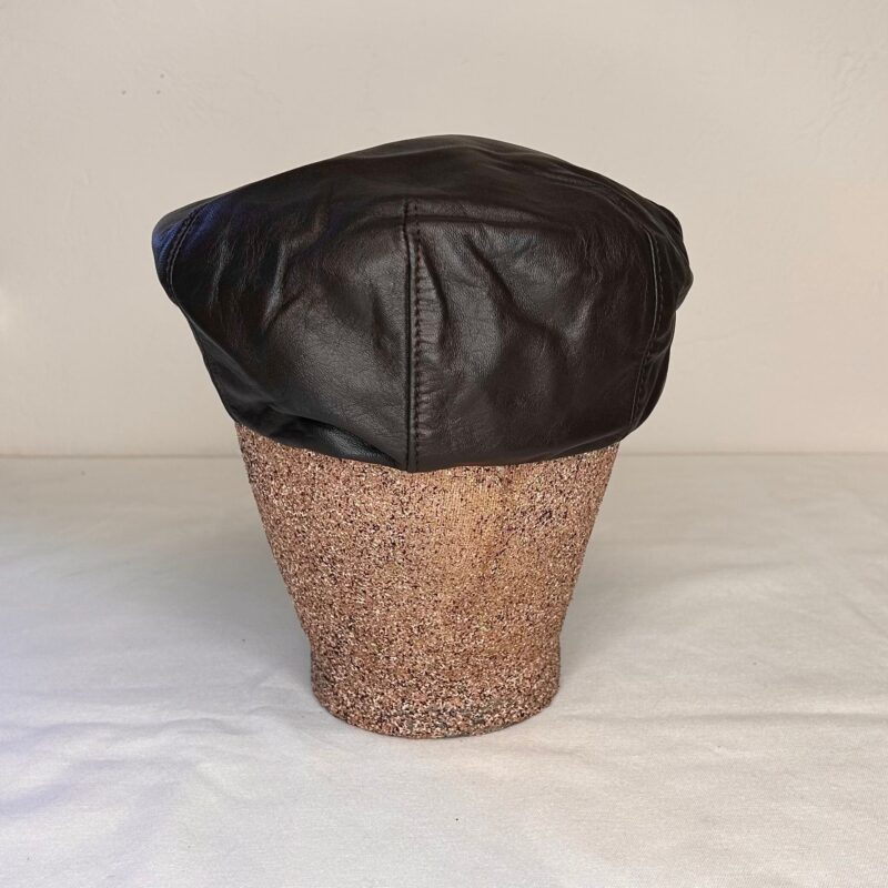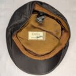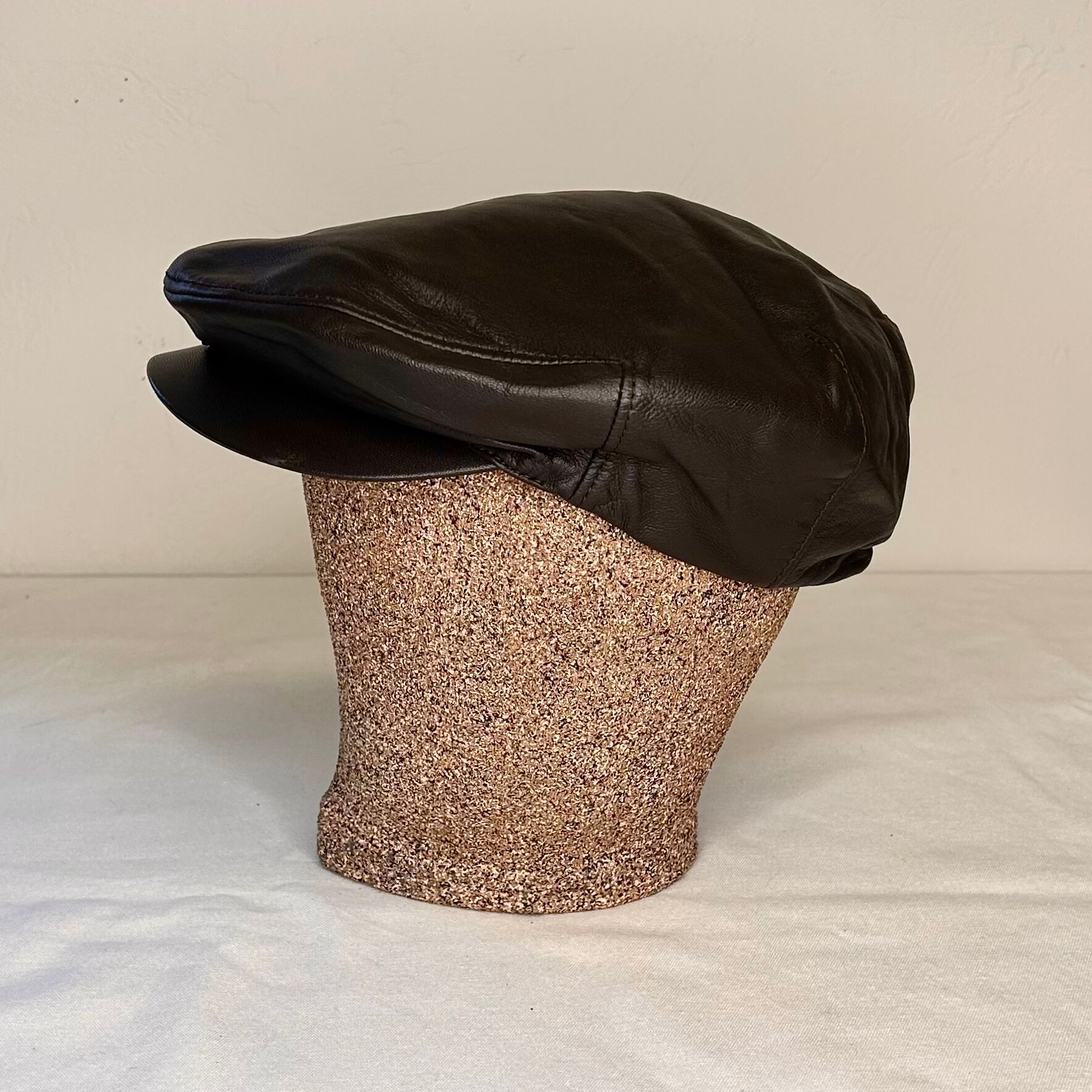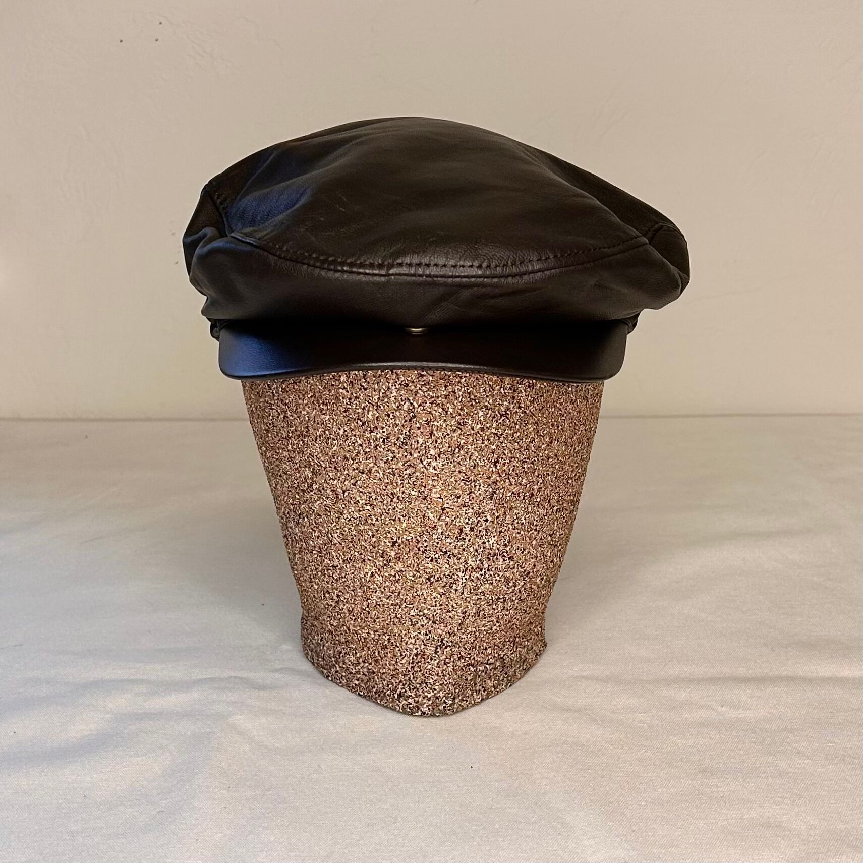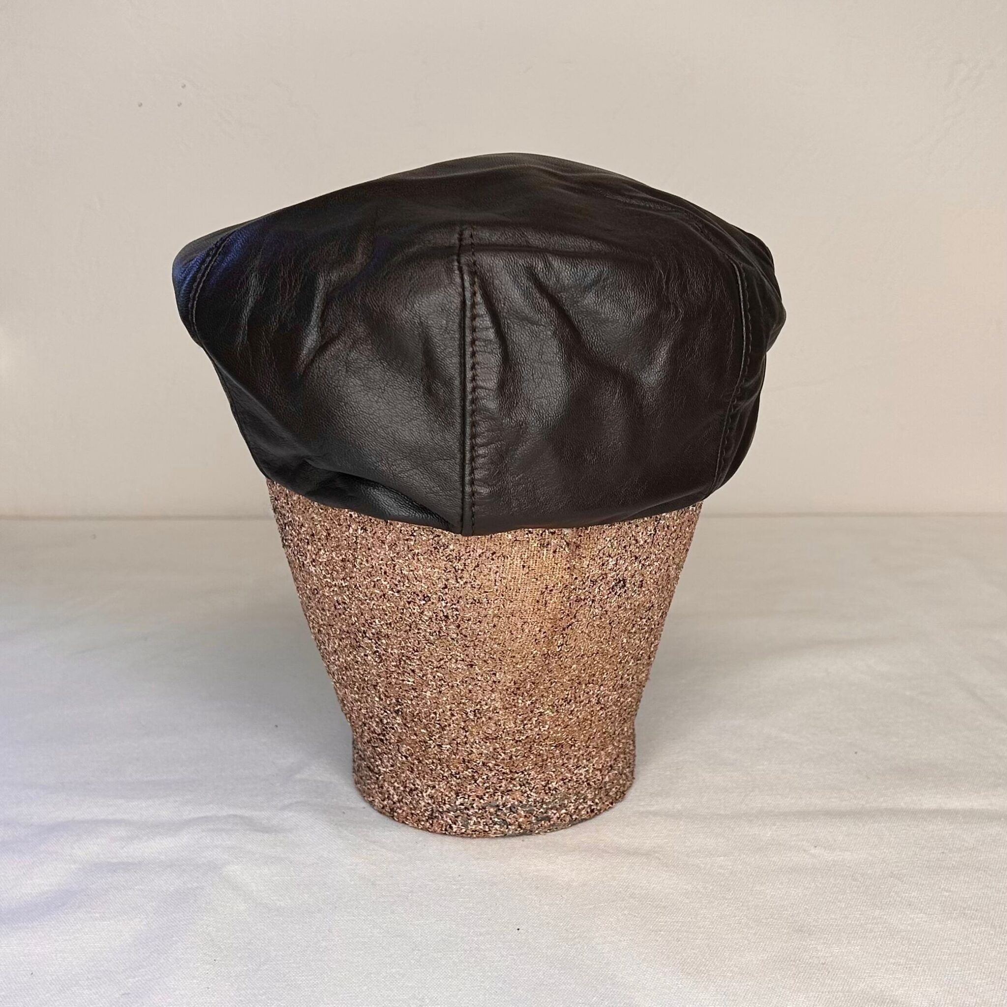 Doria Gruppo Borsalino ivy/flat cap. Dark brown leather. Snap on brim that attaches to the fabric that droops over it. Minor wear and tear on top as pictured. 100% leather. Made in Italy.