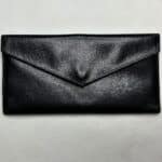 G. Gucci vintage wallet. Metal hand-shaped clasp. Envelope-style pocket on back. Green interior pockets. Gold-tone coating coming off of hand. Damage to envelope clasp.