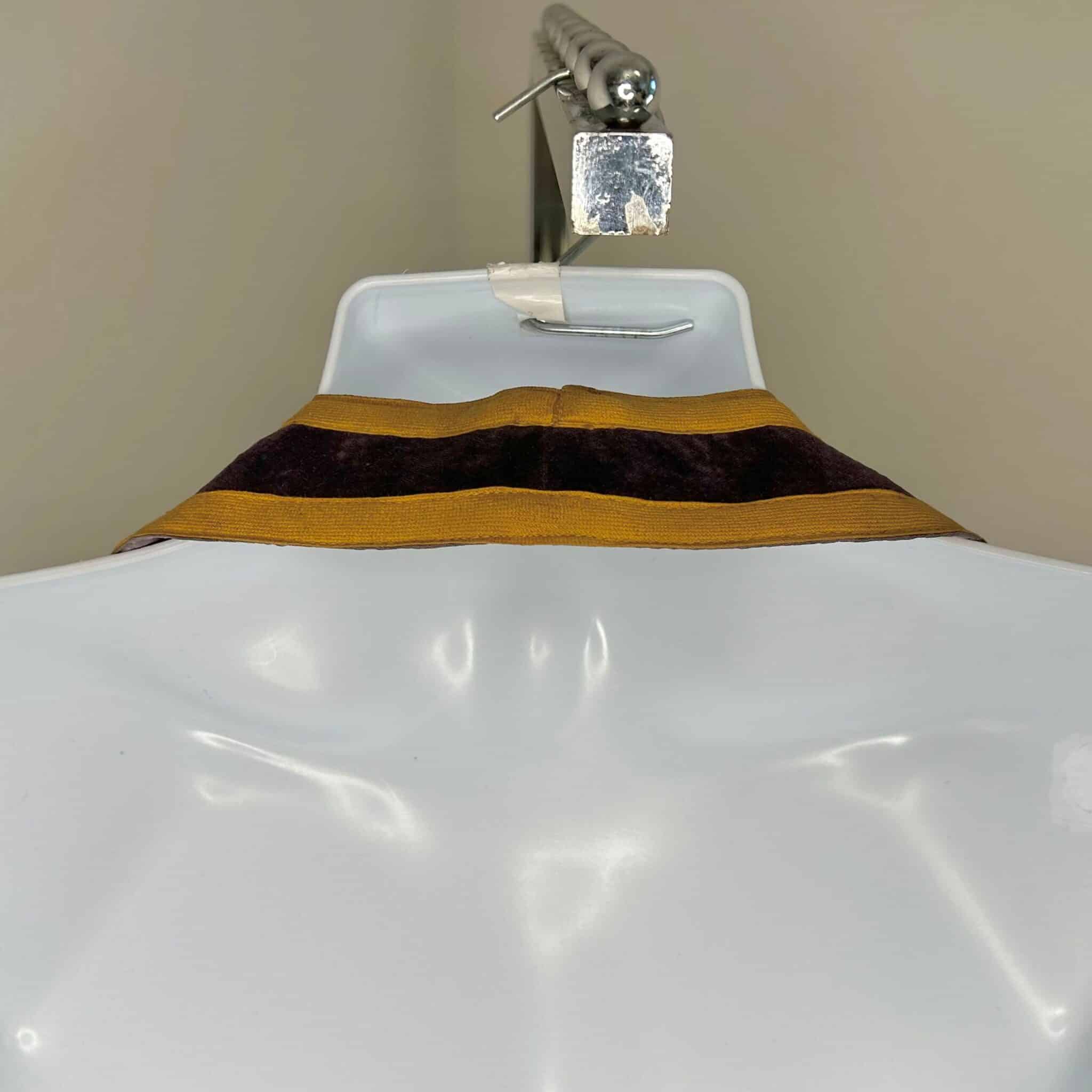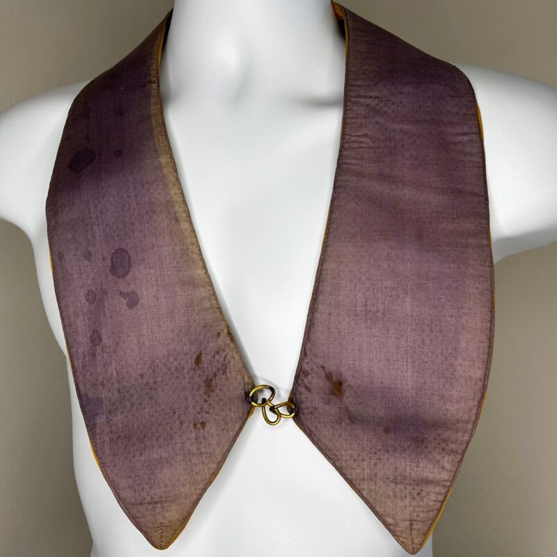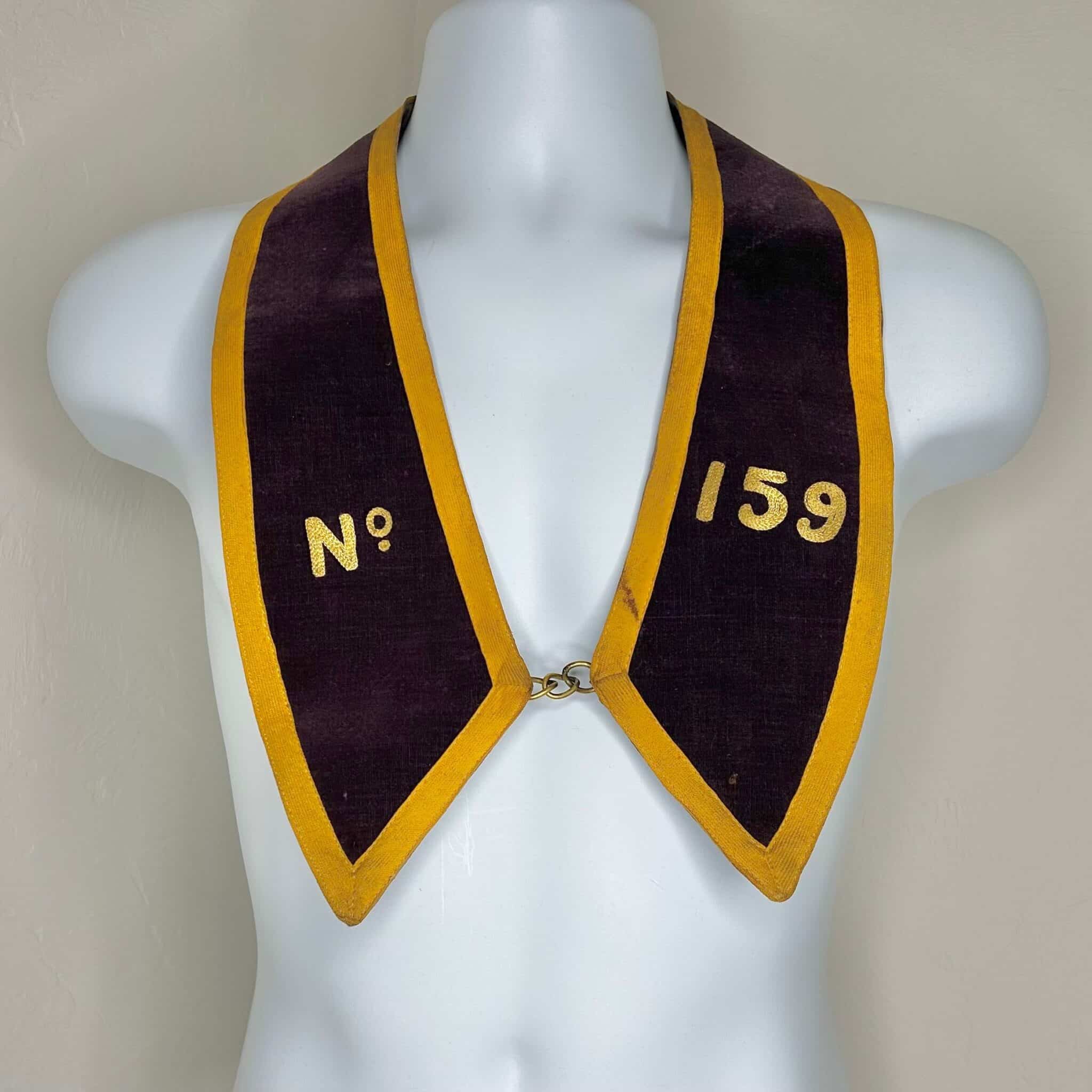 The L. E. Ward Co. vintage Odd Fellows ceremonial collar sash. Deep plum velvet center with mustard colored trim. Golden yellow embroidery. Golden chain detail. Stains and wear as pictured.